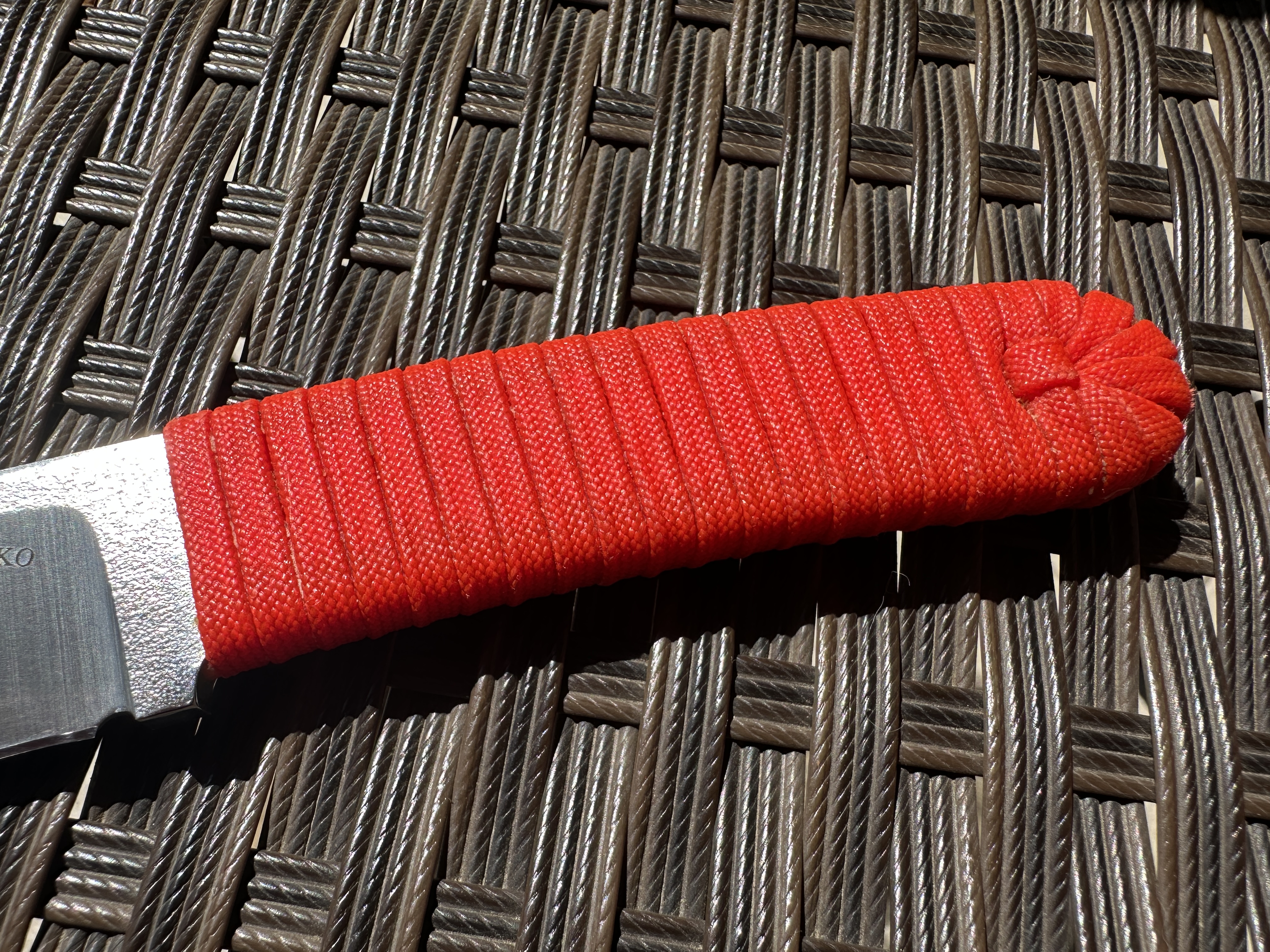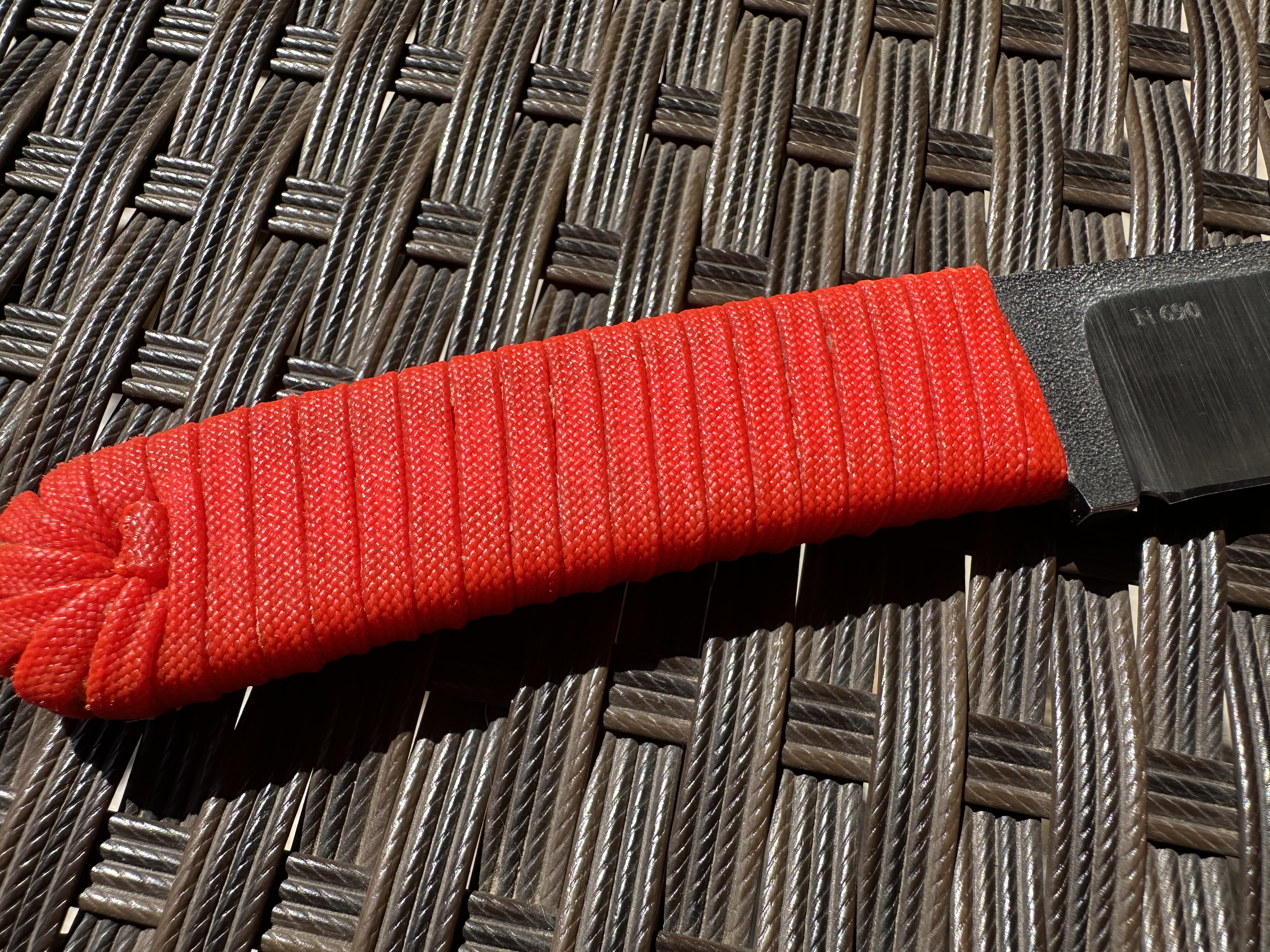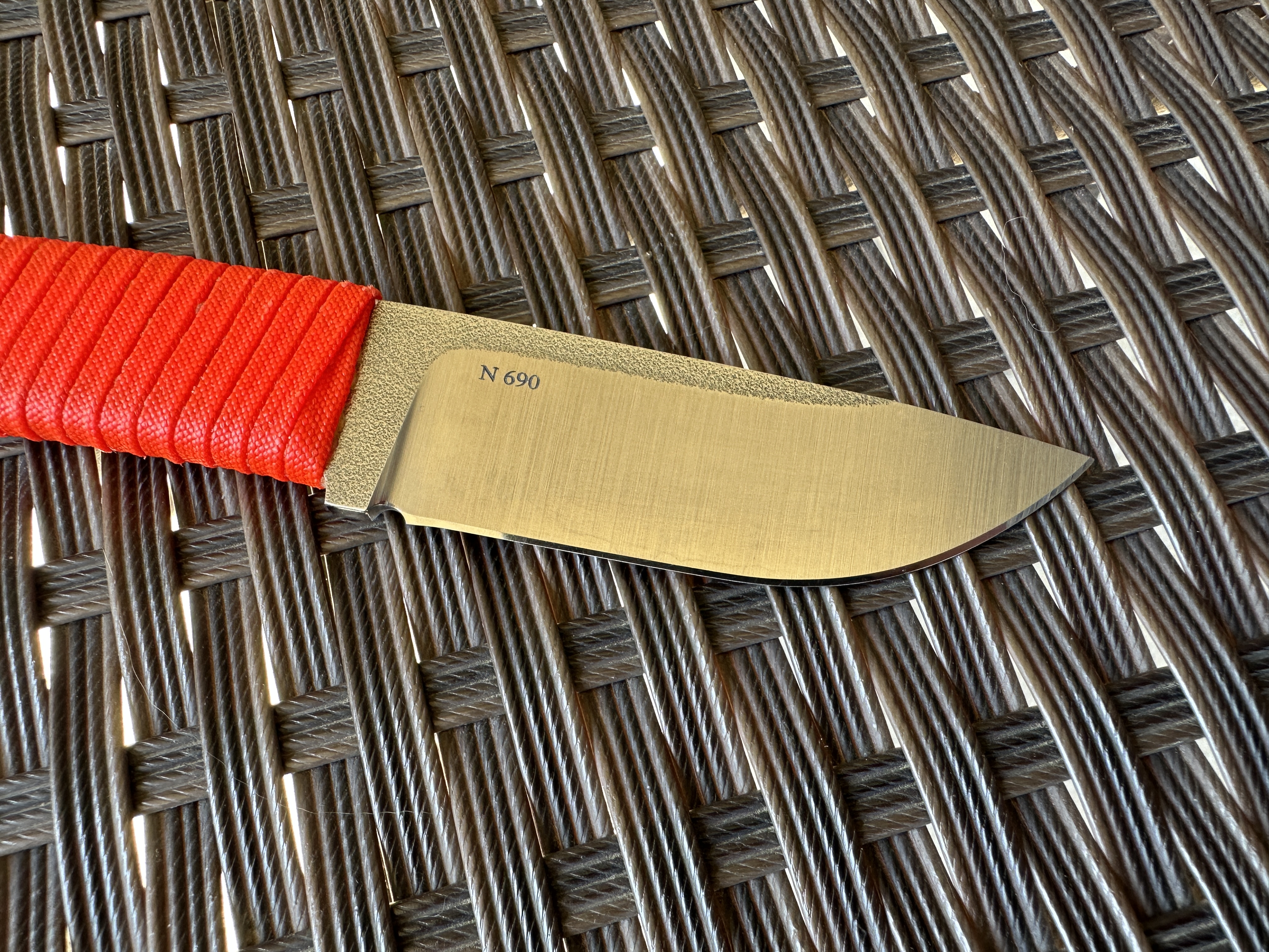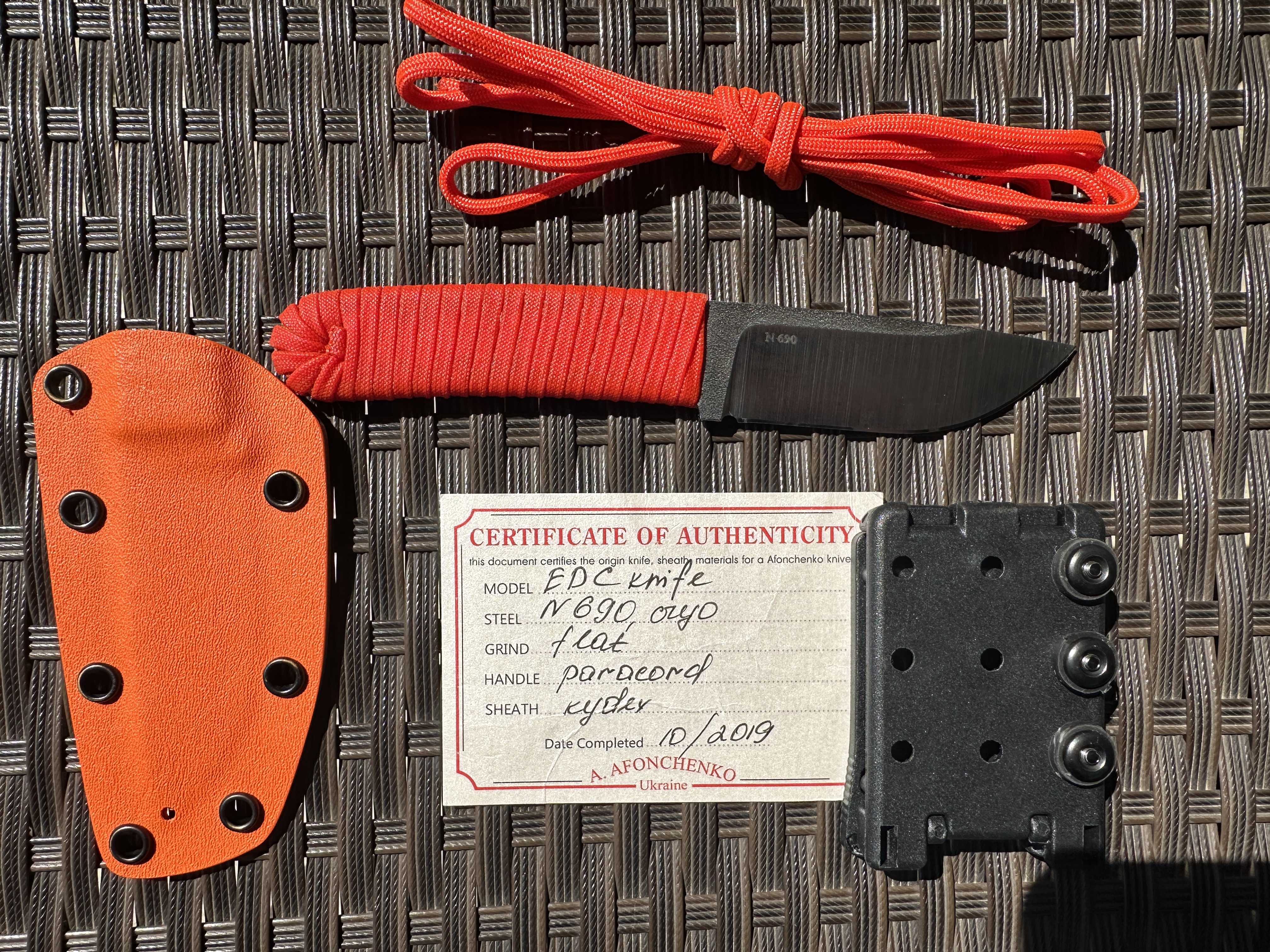 А. Афонченко Afonchenko Knives Нож б/у, один раз затачивался профессионально. Был в легком поюзе, без тяжелой работы. Царапин и сколов нет. Есть не большие потертость от кадекса. Оранжевый паракорд на рукоятке проклеен чуток видно клей. Сертификат соответствия в наличии. Цена 4100 грн. Оплата по договору, пересылка за счет покупателя. Общая длина: 18,5 см Длина клинка: 7,8 см Сталь клинка: N690 Сатин и битый лед. Ножны кайдекс + крепление