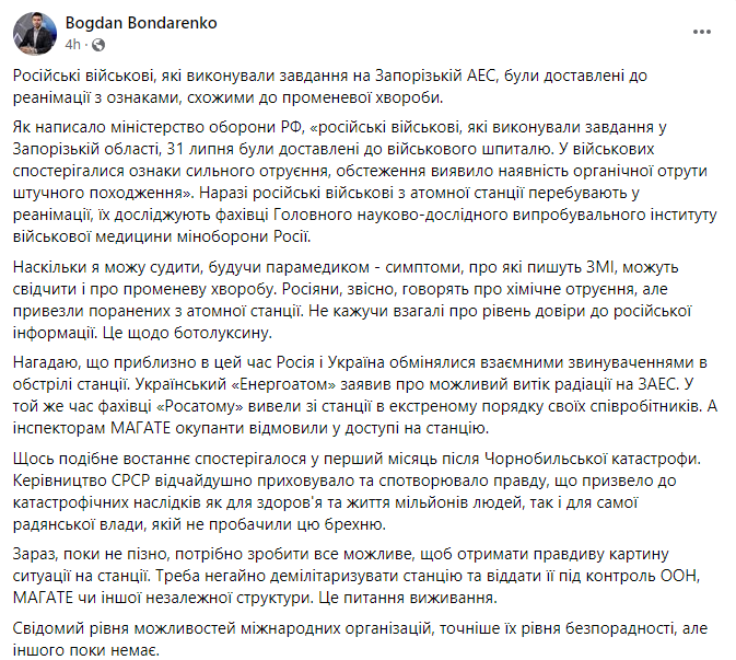 ☢️ Російських військових, які перебували на території Запорізької АЕС, доправили до реанімації із симптомами променевої хвороби, розповідає парамедик Богдан Бондаренко, який перебуває на передовій. Водночас за офіційним повідомленням міноборони окупантів, "у військових спостерігалися ознаки сильного отруєння, обстеження виявило наявність органічної отрути штучного походження". "Росіяни, звісно, говорять про хімічне отруєння, але привезли поранених з атомної станції. Не кажучи взагалі про рівень довіри до російської інформації", – наголошує парамедик. Також Бондаренко нагадав, що приблизно в цей час РФ обстріляла ЗАЕС, український "Енергоатом" заявив про можливий витік радіації зі станції, а фахівці "Росатому" вивели зі станції в екстреному порядку своїх співробітників.