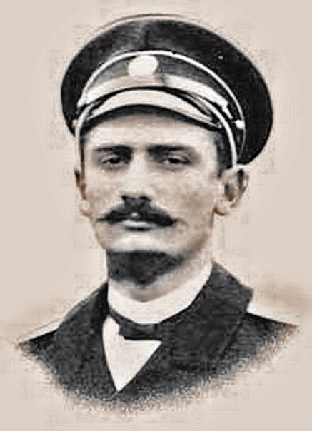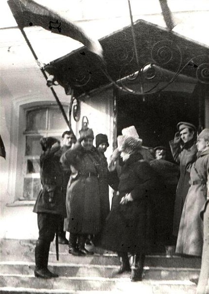 А.В.Колчак и А.И.Дутов у парадного входа в мужскую гимназию. А.В.Колчак в фуражке в дверях гимназии (на втором плане)