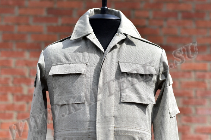 Костюм "Афганка" летний. Цвет серый. Последний вариант костюма для жаркого климата в СССР. Куртка и брюки. Артикул ткани 3303. Состав 100% хлопок. Куртка имеет 4 накладных кармана, 2 нарукавных накладных карманы, внутренний карман на подкладке, утяжка на поясе, утяжка внизу, дополнительные локтевые накладки, застёгивается на пуговицах. На брюках отстроченные стрелки, пояс со шлёвками под ремень, регулировка пояса на один размер (в меньшую сторону), 2 внутренних кармана, карман под жетон, 2 накладных набедренных кармана, утяжка внизу, дополнительные наколенные накладки, регулируемую шлёвку для одевания и ношения с сапогами, застёгиваются на пуговицах. Оригинал. Новый, с хранения. Года выпуска 1990-1992.