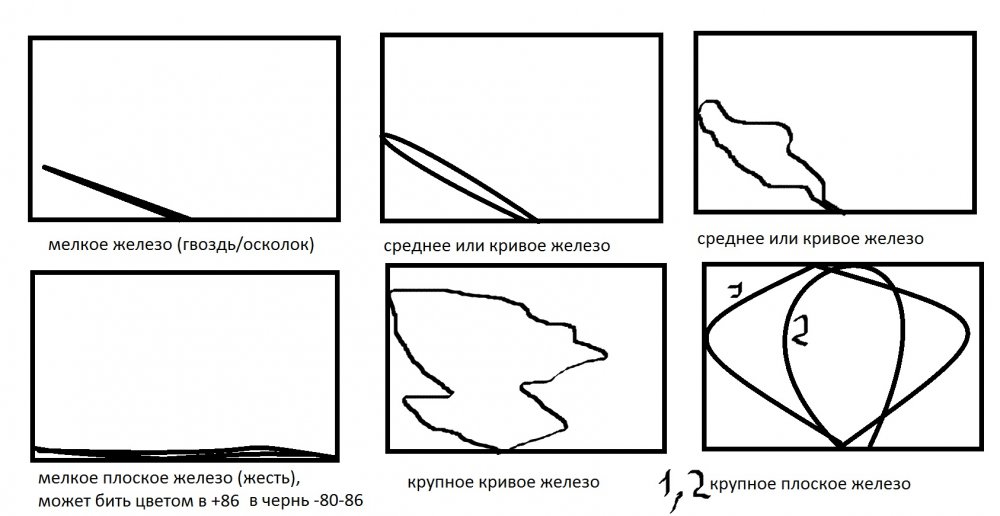 Как плюнуть. ВДИ совсем мелкого -70 и ниже, ВДИ среднего -69 и выше - это раз. Петля годографа на мелкое железо - узкая стрелка, как на монету, на среднее и кривое железо (типа затвора) - петелька, кривуля, на крупное жлезо - большая петля или кривуля через весь экран. По звуку в режиме РВ-КТ просто отличать размер неглубоких целей. размер глубоких целей отличается по годографу - как, описано выше. Определить глубокая или мелкая цель можно по рейтингу цели (справа-сверху на экране), чем меньше цифра, тем глубже цель. Чем крупнее цифра (стремится к 99), тем ближе цель к катушке или она крупная. Режим по войне - ОБЯЗАТЕЛЬНО РВ-КТ. Тип КТ - КТМ, алгоритм MSF, Усиление 6, Фильтр Электропомех (рекомендую включить) 5, Ток - Норм, Чувствительность до 18, Порог 19-20. Мини пособие, примерно так: