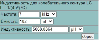 У меня датчик ДД 10" АКА 7кГц 1-2 пин - 10.49 Ом (это RX катушка параллельный контур), 3-4 пин (ТХ катушка последовательный контур) 102.28 нФ. По формуле выходит катуха имеет 5.06mH