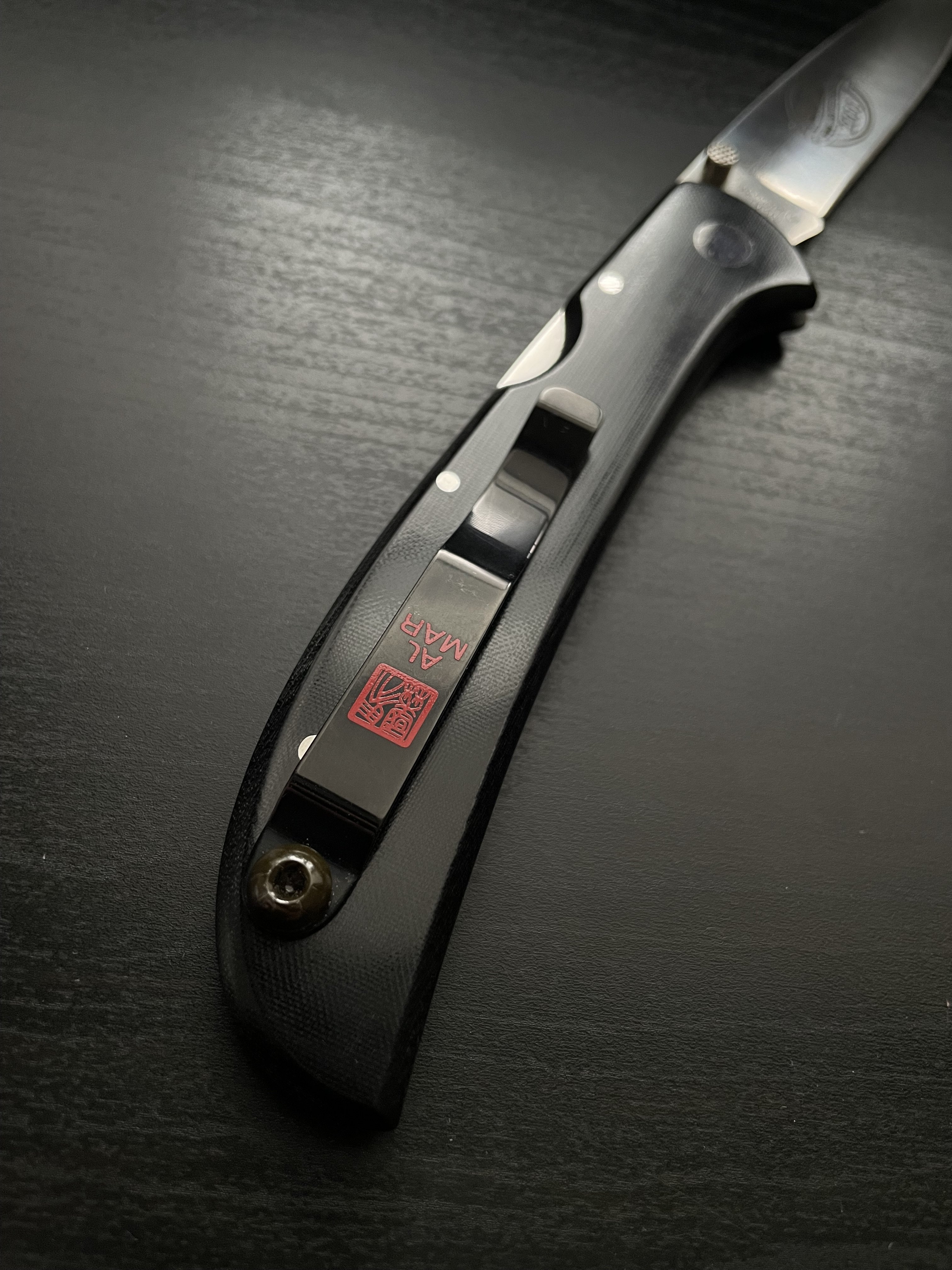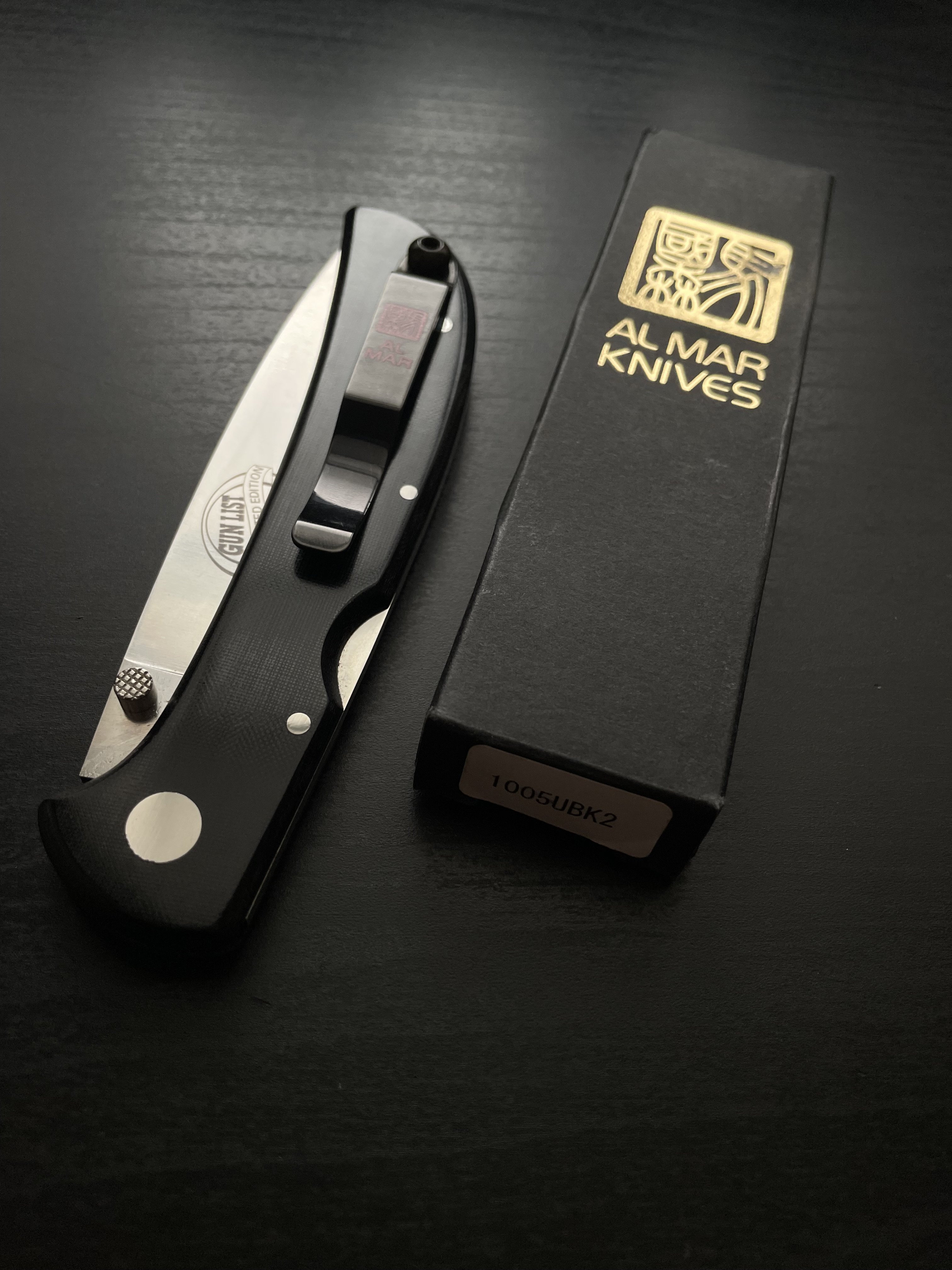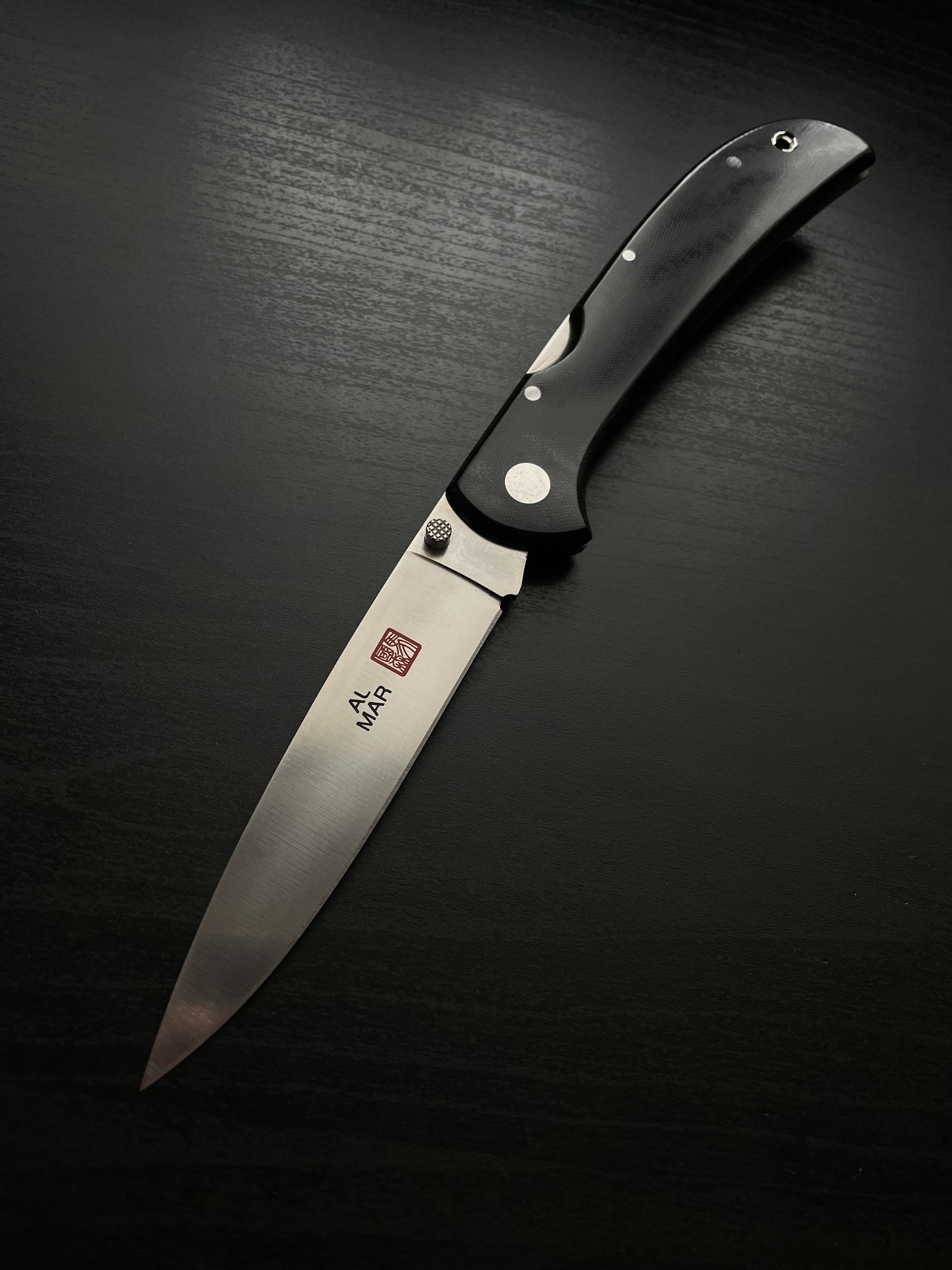 Al Mar Eagle Ultralight 1005UBK2 Вінтаж. Артефакт. Раритет Елегантний ніж японського виробництва. Eagle - це один із знакових фолдерів виготовлених компанією AL MAR, який перемагав не на одній виставці за інноваційний дизайн ( у 1997-2000 рр.). Класична чорна полірована мікарта, позначки бренду, лімітованість - люкс. Стан: 9.9/10 Новий в коробці. Мікросліди від часу. ~26~29 років ножу Відео з ножем за посиланням Характеристики: Рік виробництва: 1997-2000 рр. Загальна довжина: 224 мм Довжина клинка: 100 мм / 90 рк Товщина клинка: 2,5 мм Сталь: AUS-8 Вага: 68 гр. Країна виробник: Japan Ціна: 10,400 грн