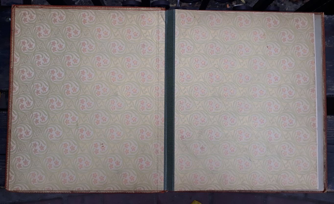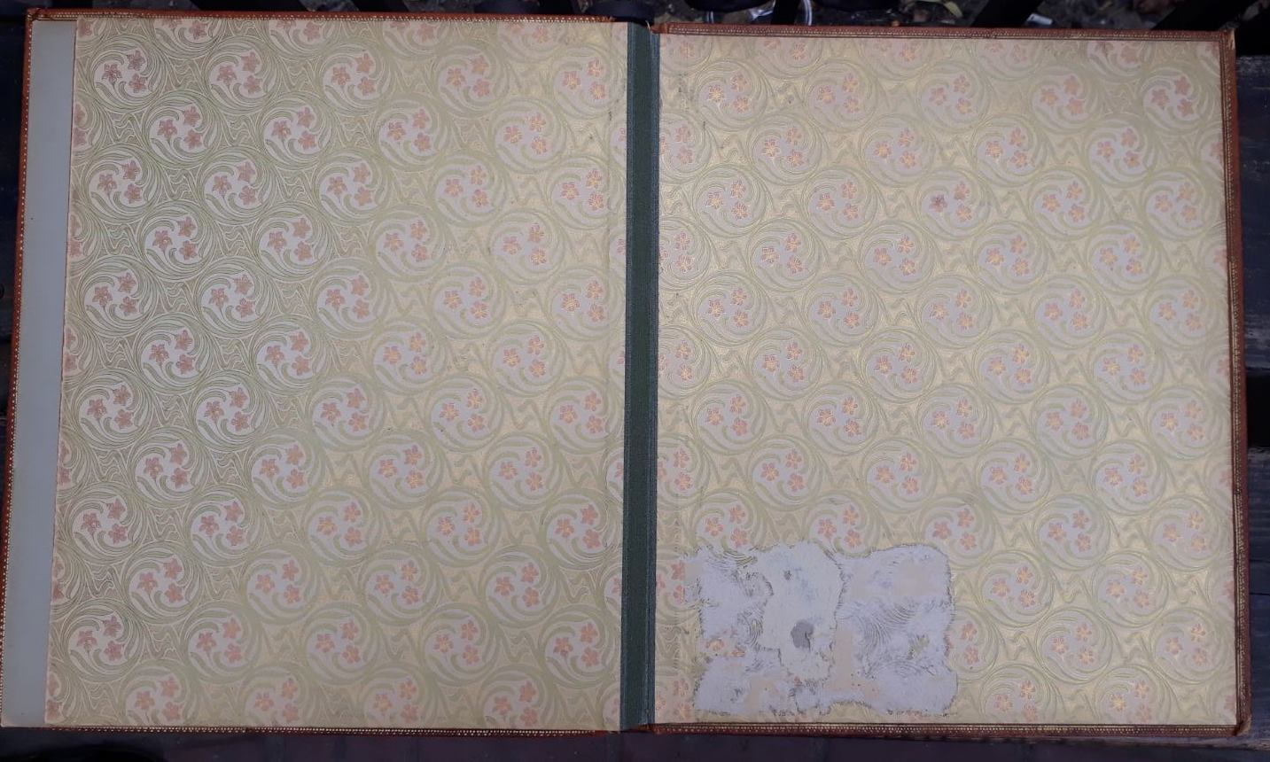 Приветствую. Пожалуйста, подскажите по данному альбому, кому мог принадлежать? Есть подпись под оставшимся рисунком. Альбом выполнен из кожи и металлических накладок с позолотой. С обратной стороны альбома по коже теснённый герб, - видимо фамильный. С ув