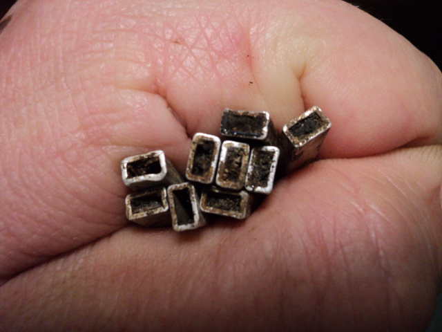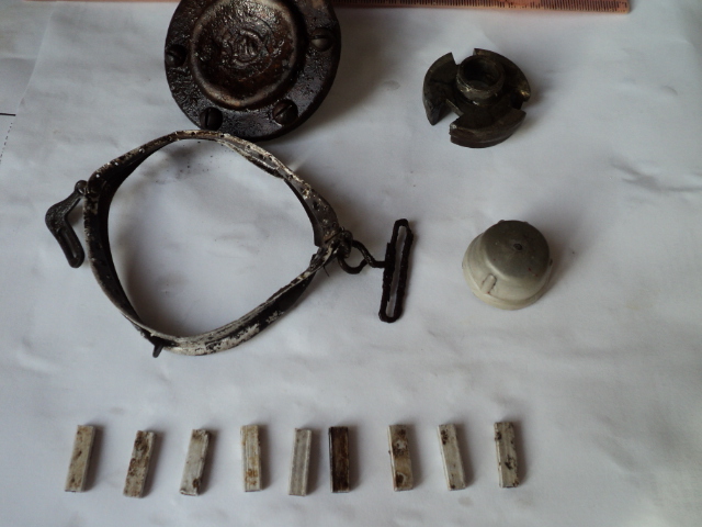 Вот сегодня по выбитым местам нарыл всякого хлама. Патроны ппш зарыл поглубже обратно. А интересные непонятки забрал и сфоткал на бумаге. Подскажите по ним. Особенно интересуют маленькие алюминиевые трубки прямоугольного сечения. Хотя они забиты, предполагаю, что отверстия в них сквозные. Вырыл их все в одном месте, и еще там осталось, т.к. надоело их копать. И по остальным тоже буду признателен за подсказки. Колпачок из гибкой пластмассы без резьбы.