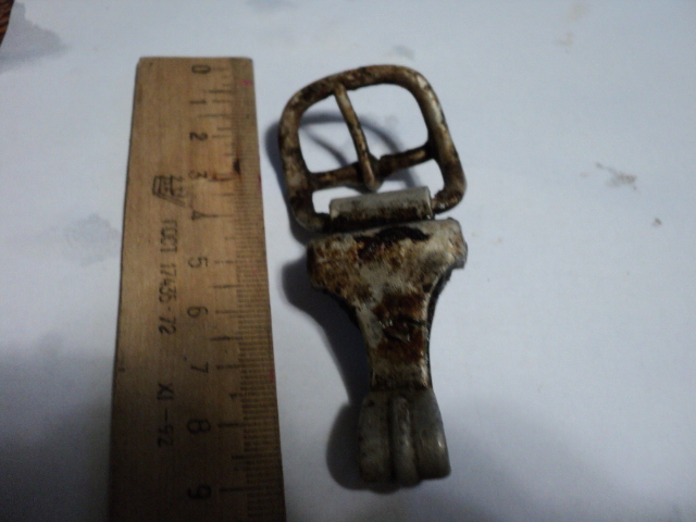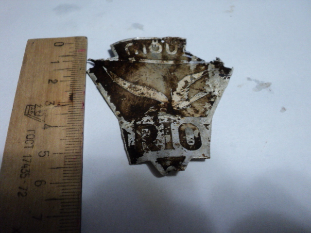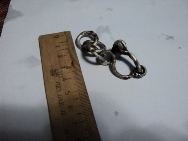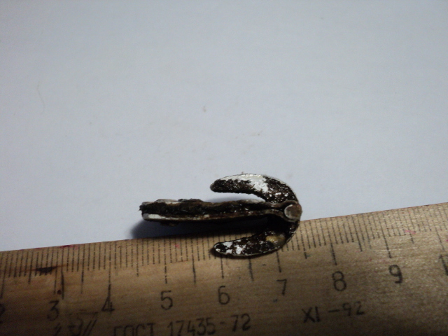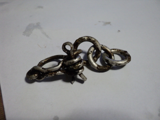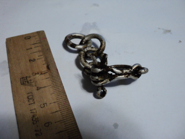 Вот еще алюминий. Остатки какой-то эмблемы. Может от велосипеда? Карабинчик с пряжечкой непонятно от чего. И цепочка с замочком со шпилькой. Все из алюминия. Может встречал такие вещи кто?