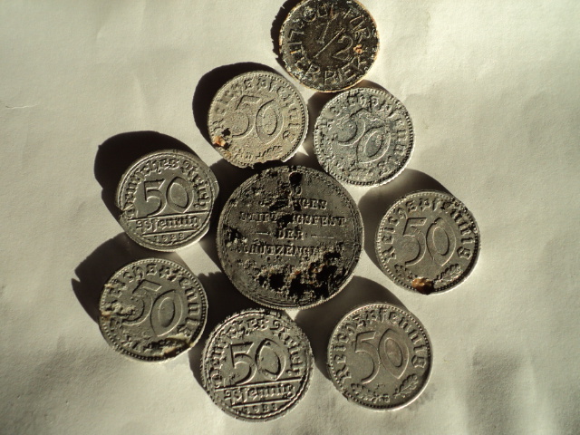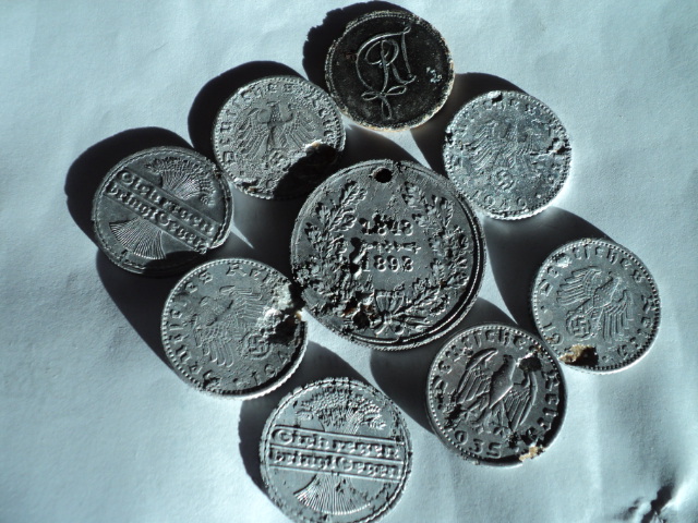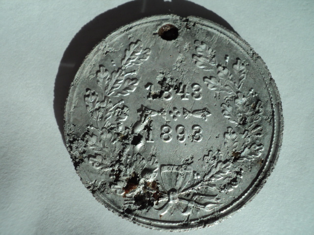 Вот почистил алюминиевые монетки и жетон на поллитра пива и медаль 1893 года по поводу 50-летия чего-то. Интересно чего?
