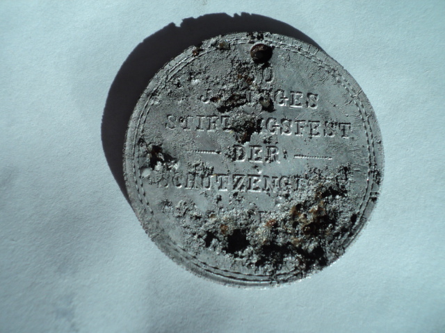 это, знаете, как в одном известном произведении:"...на стене под стеклом висела литография "Остров мёртвых". стекло в углу картины отломилось и поэтому открытая её часть была так загажена мухами, что узнать, что творилось в этой части острова мёртвых было уже практически невозможно." так и с вашей медалью: многие части слов скрыты под слоем окисла и поэтому можно предположительно перевести так: 50-летний спонсорный праздник от общины стрелков... 50-jaeriges stieftungsfest der schuetzengemeinde... имеются конечно же в виду не стрелки пехотных батальонов, а любители, охотники и т.д.