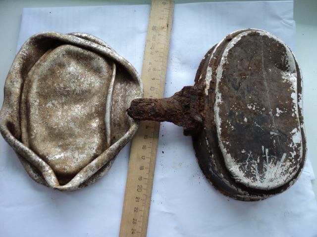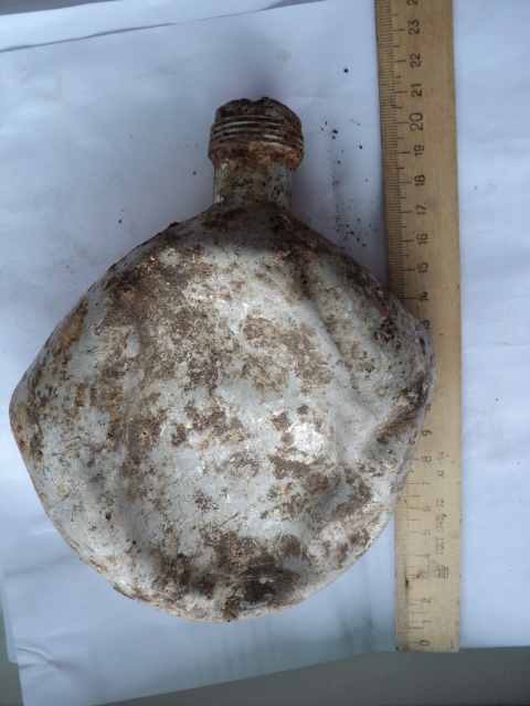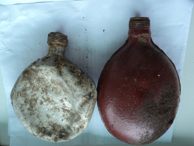 Вот еще хламированный люминь по войне. Две бывших крышки от котелка и фляга. Немец? Расплющенная из очень толстого хорошего металла. Найдена около дороги. Видать транспорт проехался. По алюминиевой фляге вопрос, что она такая маленькая? На последнем фото в сравнении с обычной железной. Могут ли на них быть клейма?
