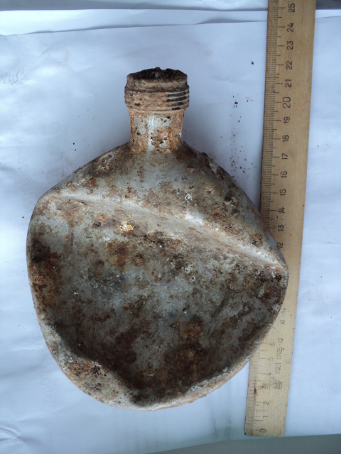 Она расплющена, а не согнута. Поэтому кажется больше. В недеформированном состоянии она бы выглядела еще меньше. Может быть эта фляга для маленьких. В сопутке остатки детского штыка.