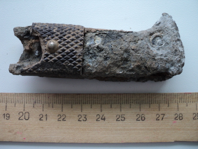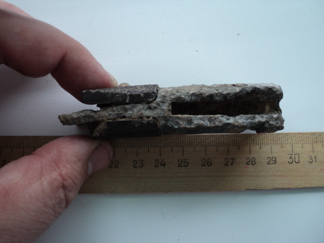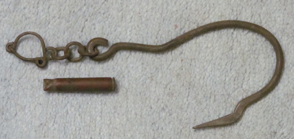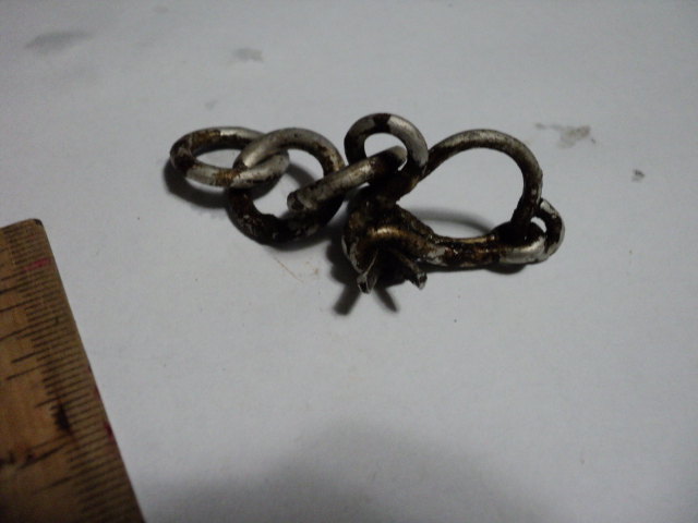 Цепочка - это от крюка. Предназначение крючка вызывало в свое время обширную дискуссию. Возможно крюк связистов. Материал изготовления был разный. У меня крюк видимо из бронзы-желтый метал.