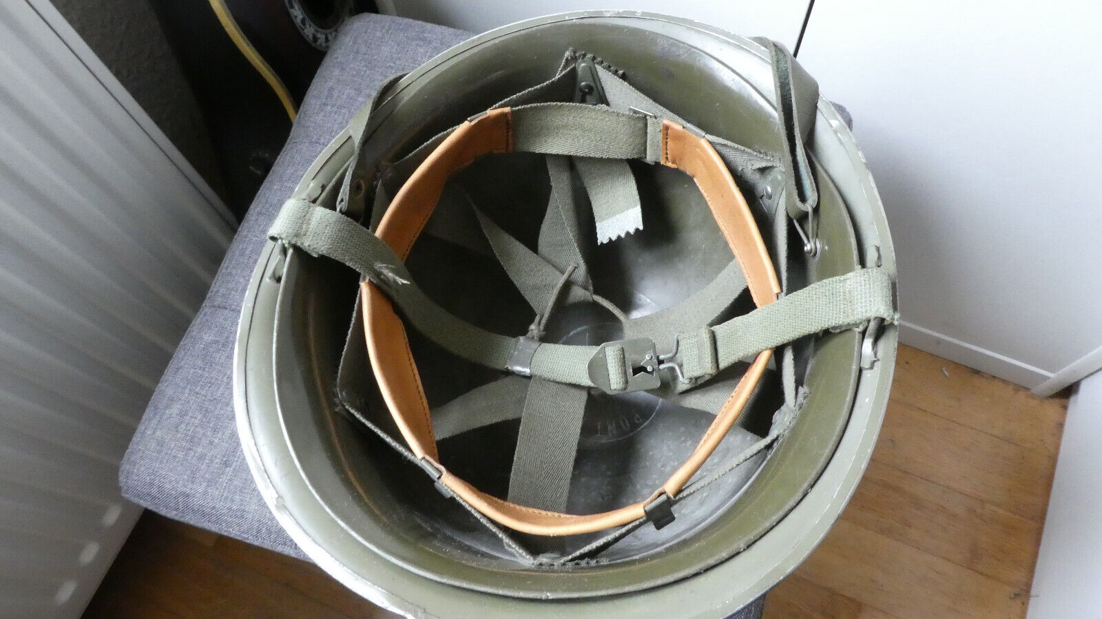 Клон М1 напівшишечки. Сфера французського M51. А от такий підвіс - дещо цікаве, не бачив саме такого. В стандартних шоломах для війська йшов вставний, конструктивно аналогічіний американському М1. Чи то рукоблуд з іншого заводського підшолома - одразу не скажу. Мені бачиться саме адаптація, а не повний самопал.