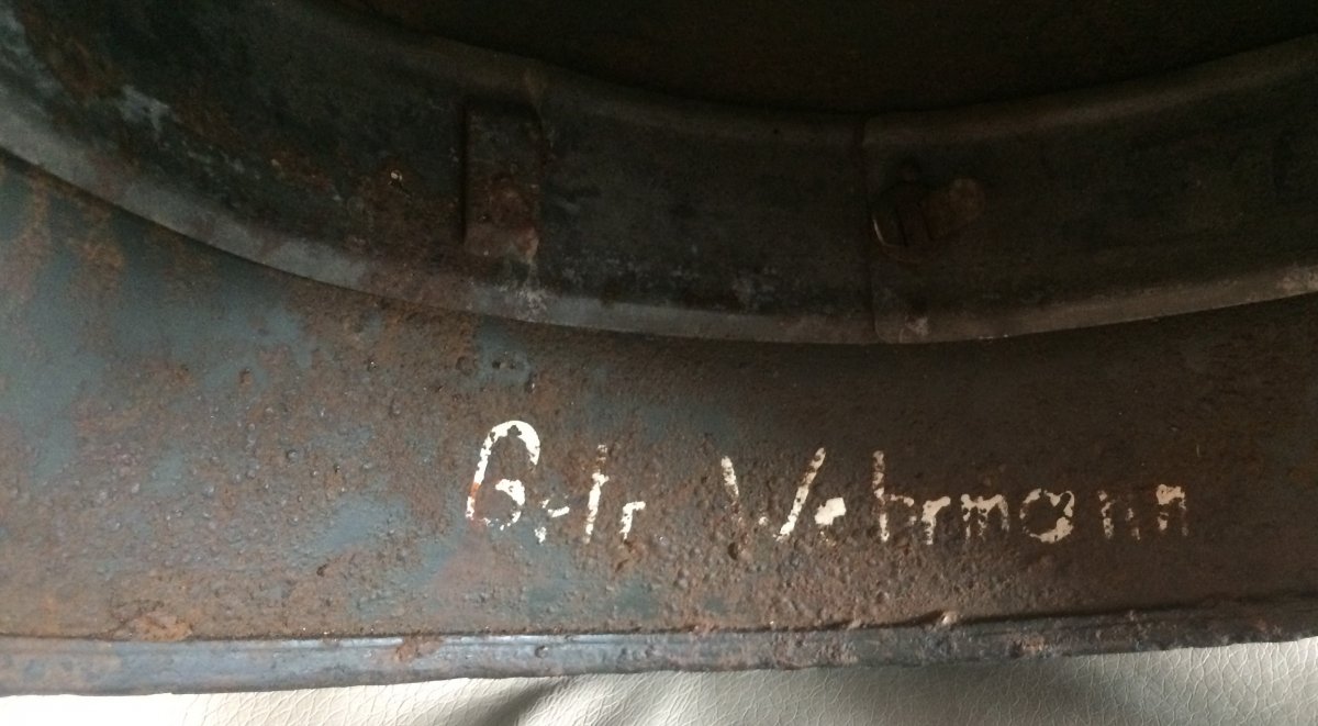 Пару шлемов свежих.Оба подписные.Белый пулеметчика 100% по августу 1944.Пробился гефрайтер сразу именно у той деревни где найдены шлемы.Еще второй был,тоже битый.В пулеметной ячейке с настрелом по щиколотку.Позиции 540 штрафного z.b.v. батальона.Там бои были только в 1944 в августе неделю,раньше не было вообще.И пробился погибшим 9 августа прорыв линии Мариенбург.120 минами закидали.Почему шлем белый,понятия не имею.Может чехол был сорвало. И зеленый с пряжкой,из траншеи,с высоты Казачий Курган под Сталинградом,декабрь 1942.Сзади вошли осколки.Тоже минами.Один прошел и шишку дунул на лбу возле кламмера.Кожа подписана двумя владельцами.