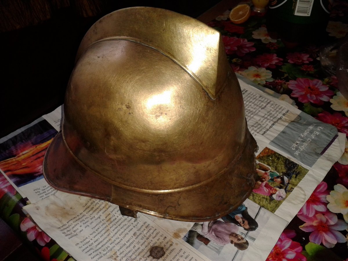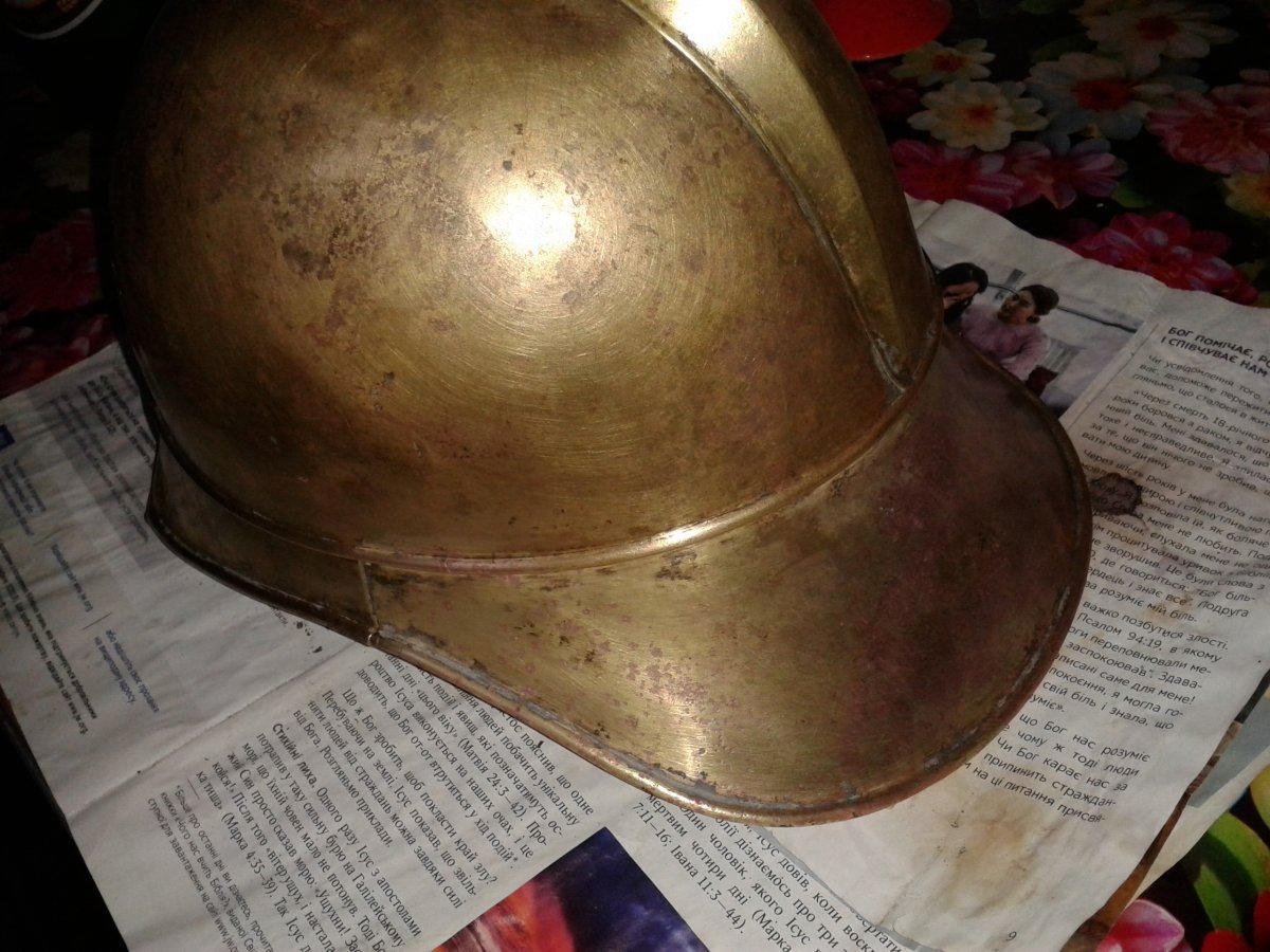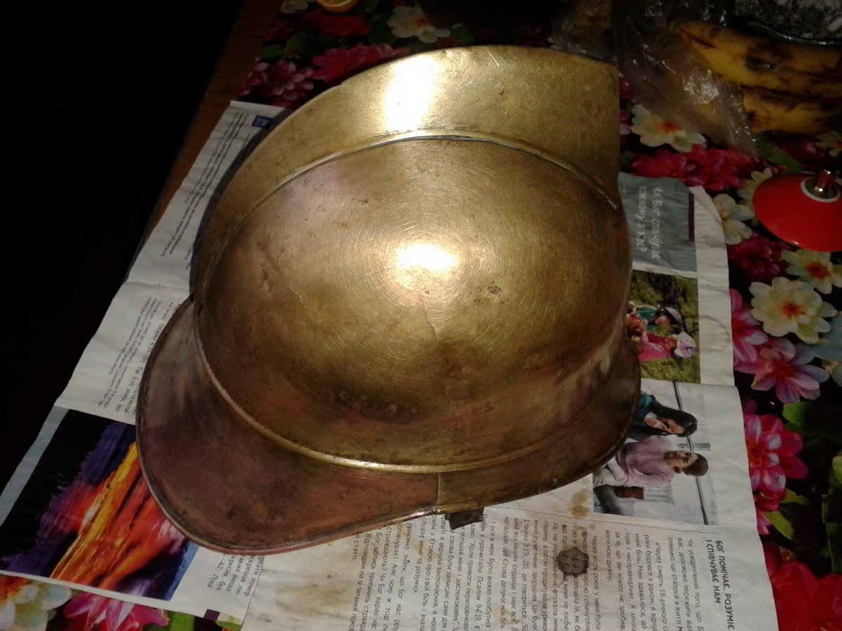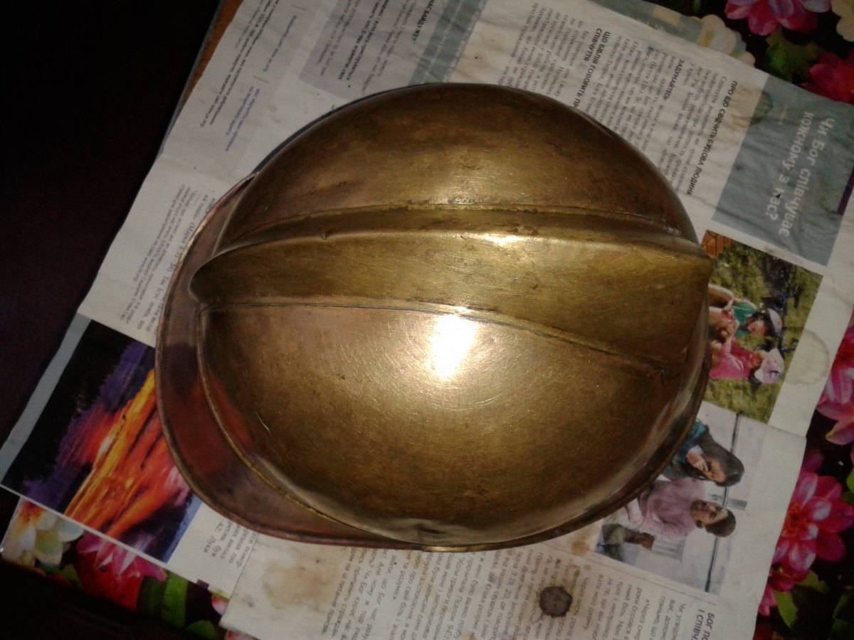 Знайшов таку шапку в болоті, зараз чищу і натираю... Потім ще прийдеться заварити невеличкі тріщини, і буде файна, антуражна річ.