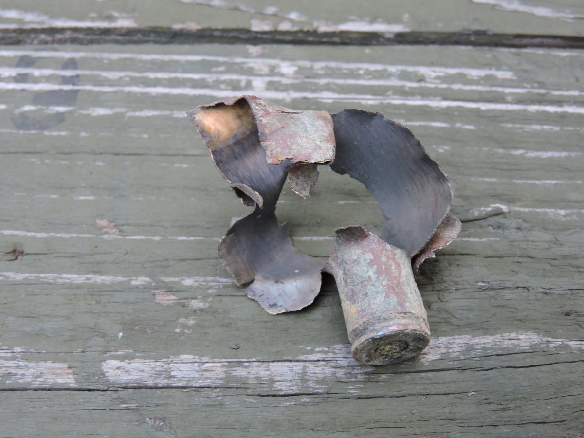 И вот еще несколько. самое загадочное это гильза в гильзе, я думаю внутри пуля была зажигательная. я однажды находил маузер с загнутым дульцем и разорванный а внутри пуля моськи зажигательная тоже разорванная. Теперь стоит на полке, явно кто то развлекался уже сейчас но смотрится интересно, фото где то было, а возможно уже и в теме есть