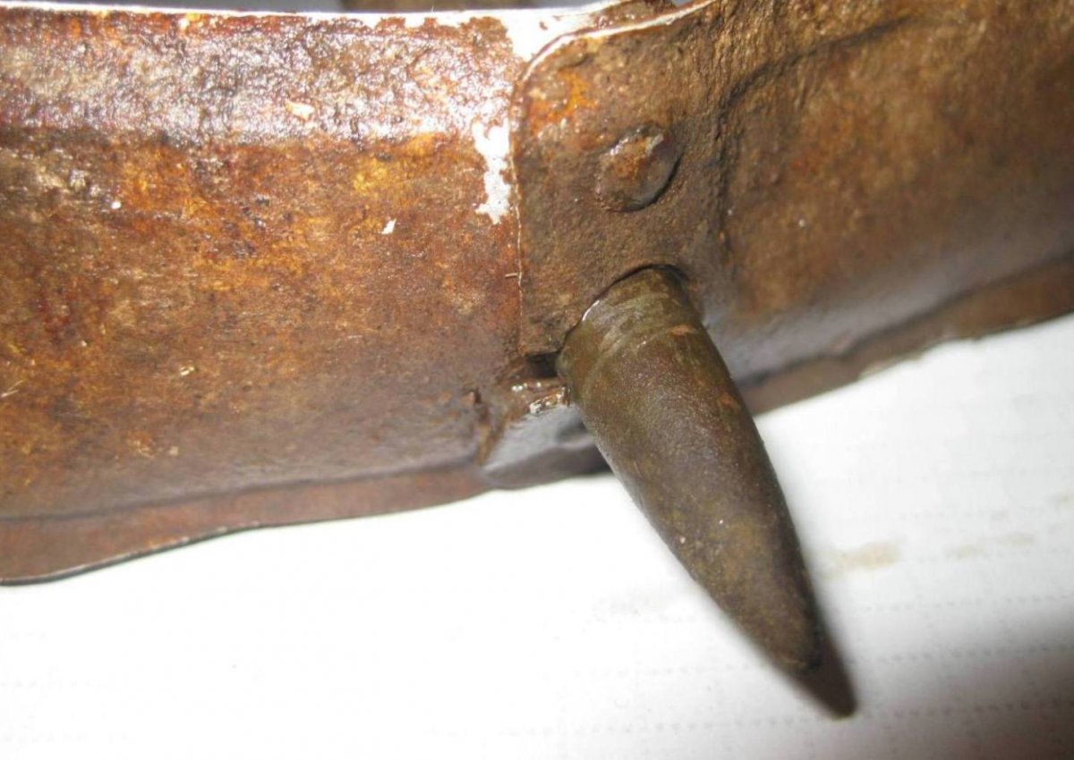 Какая кровища через почти 80 лет в земле?!Может Вы за кровищу что то другое приняли? И как вы узнали что диаметр вxодного отверстия 7.62 когда на вашиx фото пуля торчит в заднем кламерном отверстии обруча, в таком случае измерить отверстие от пули в принципе невозможно , потому как оно (в чем у меня есть большие сомнения)налажилось на технологическое отверстие самого обруча.