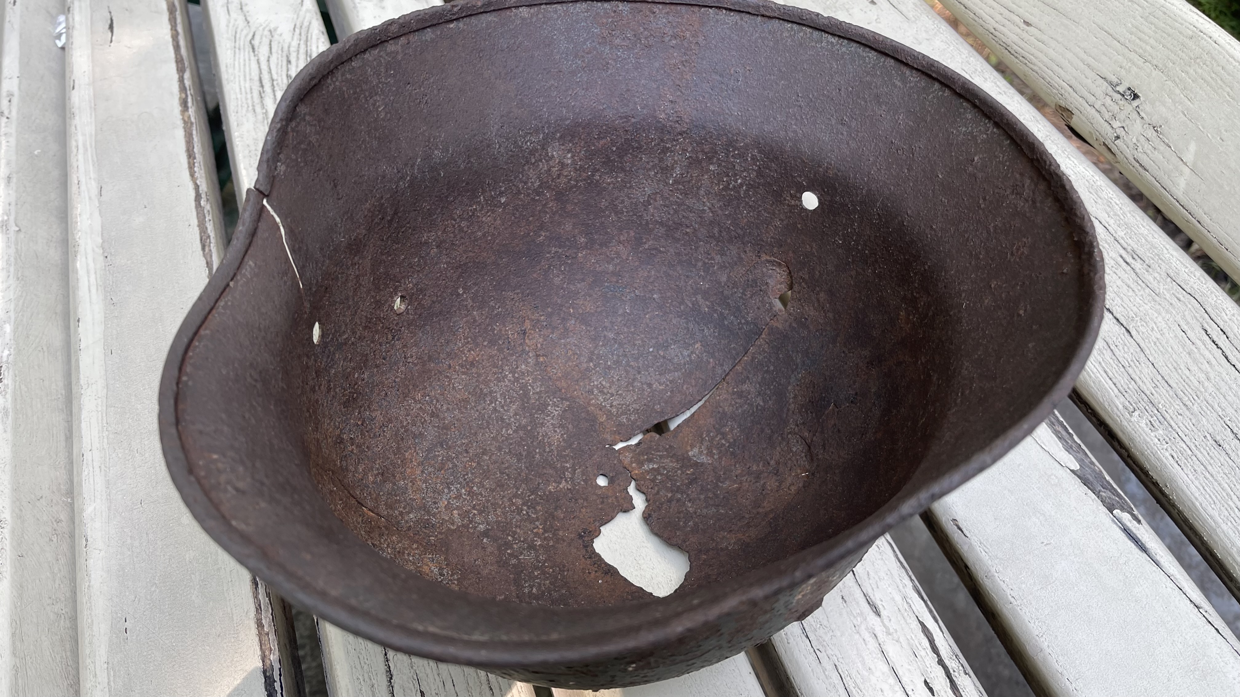 Мина не имеет такой кинетической энергии - чтобы сделать аккуратненькое входное и выходное отверстие. И уж точно никакого подрыва "не відбулося" ....иначе "архитектура'" каски была бы совсем иная....