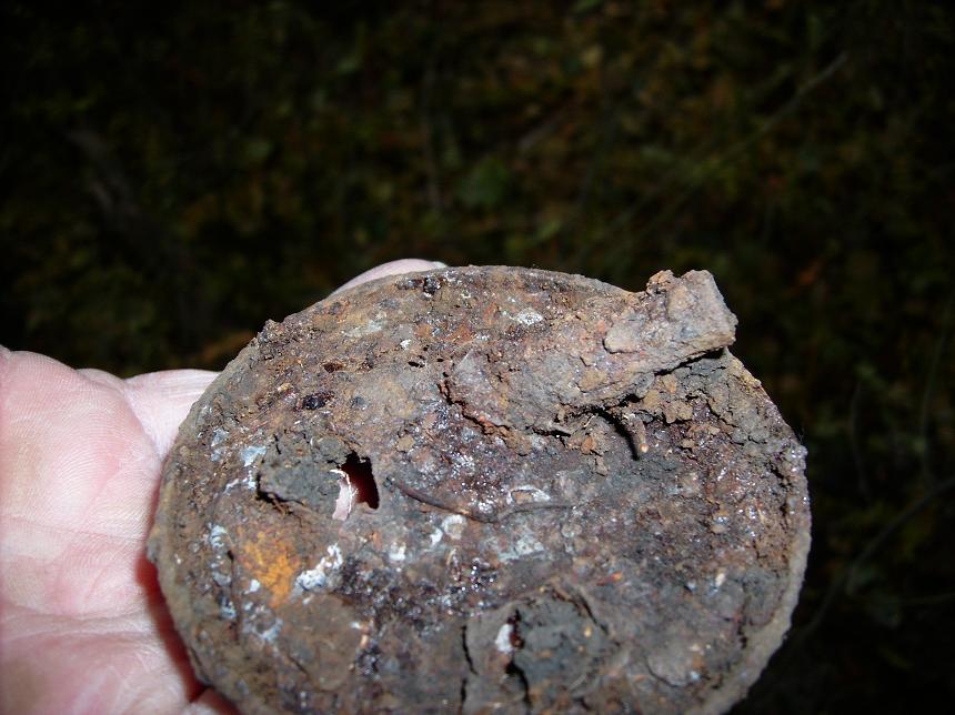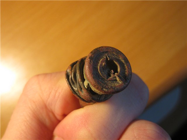 Мне тоже такие гильзы попадались, и не только мне. Помоему в етой же теме их и обсуждали.Но к единогласию так и не дошло.В моей гльзе были остатки дерева. Суто мое мнение ее забивали в дерево причем чемто деревяным, потому как клейма на месте.