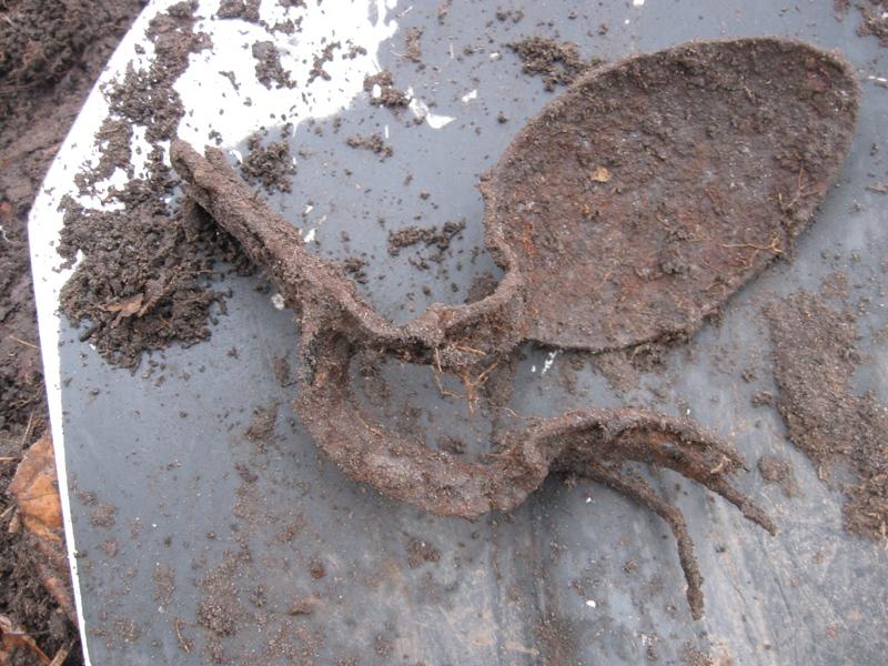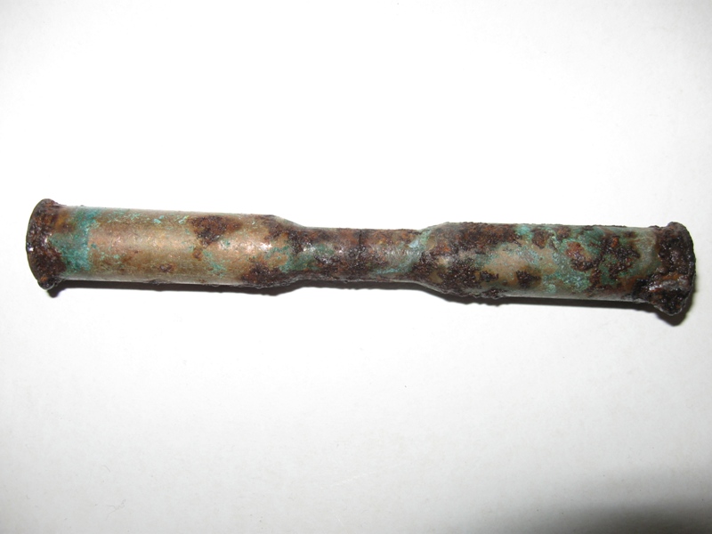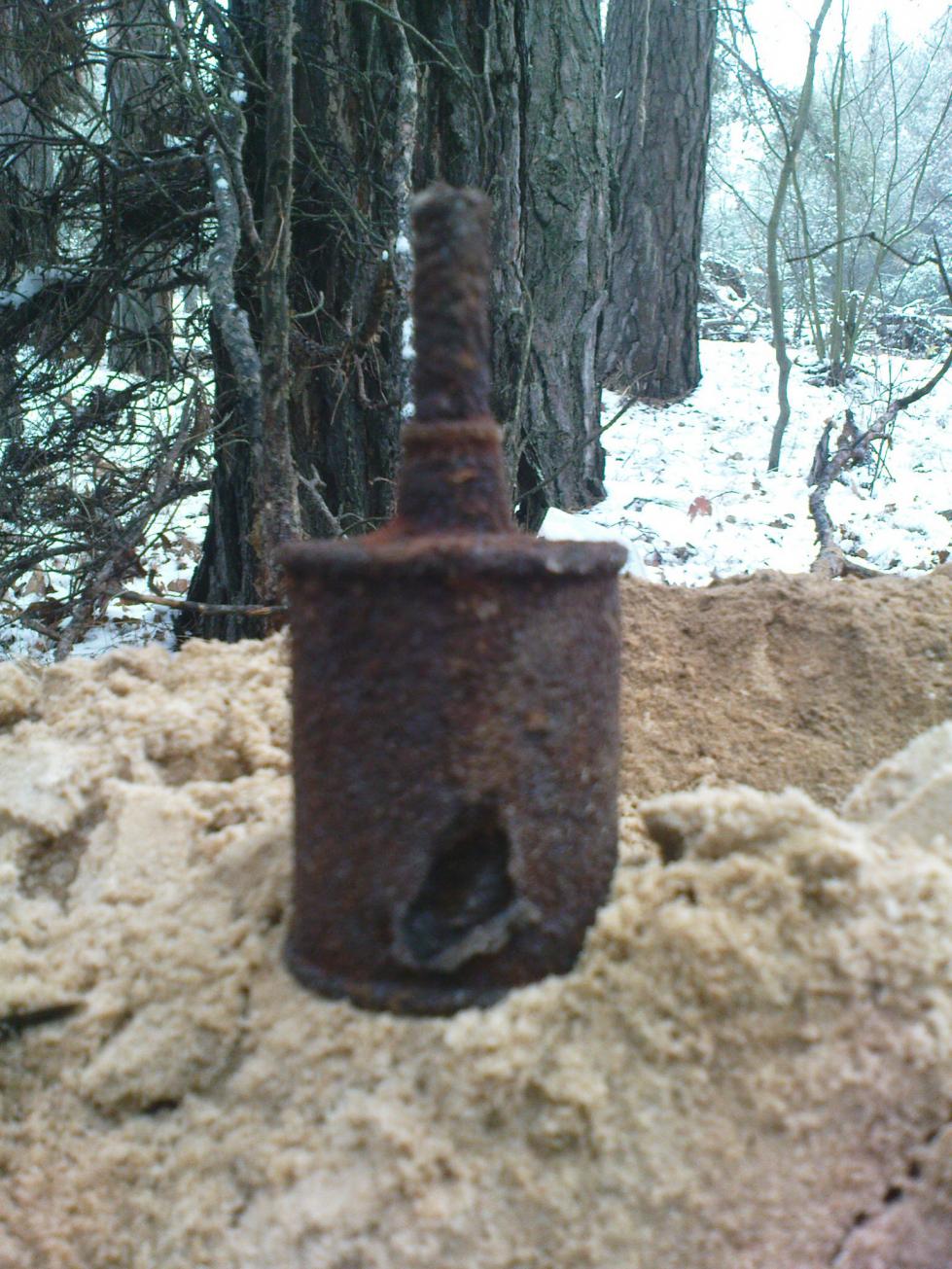 Весной 2011 попалась вот такая каска.Предполагаю ,что выстрел в лоб из винтовки.Возможно снайпер.Отверстие не сквозное.Находилась в ячейке РККА