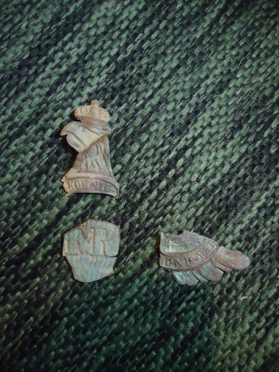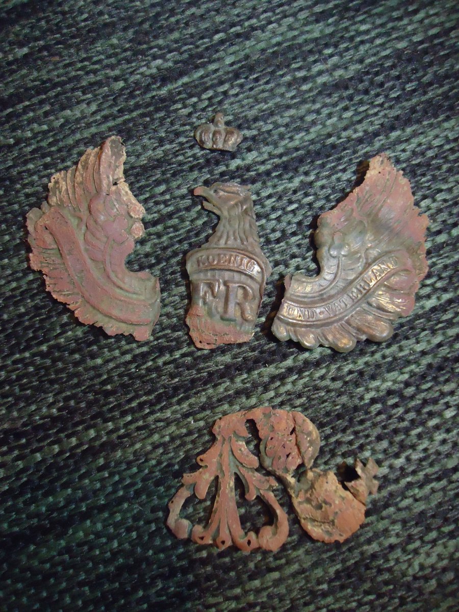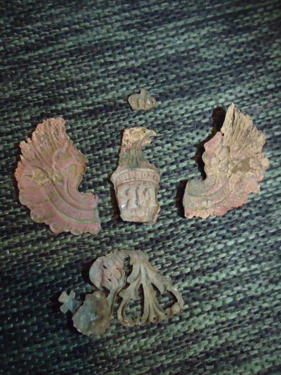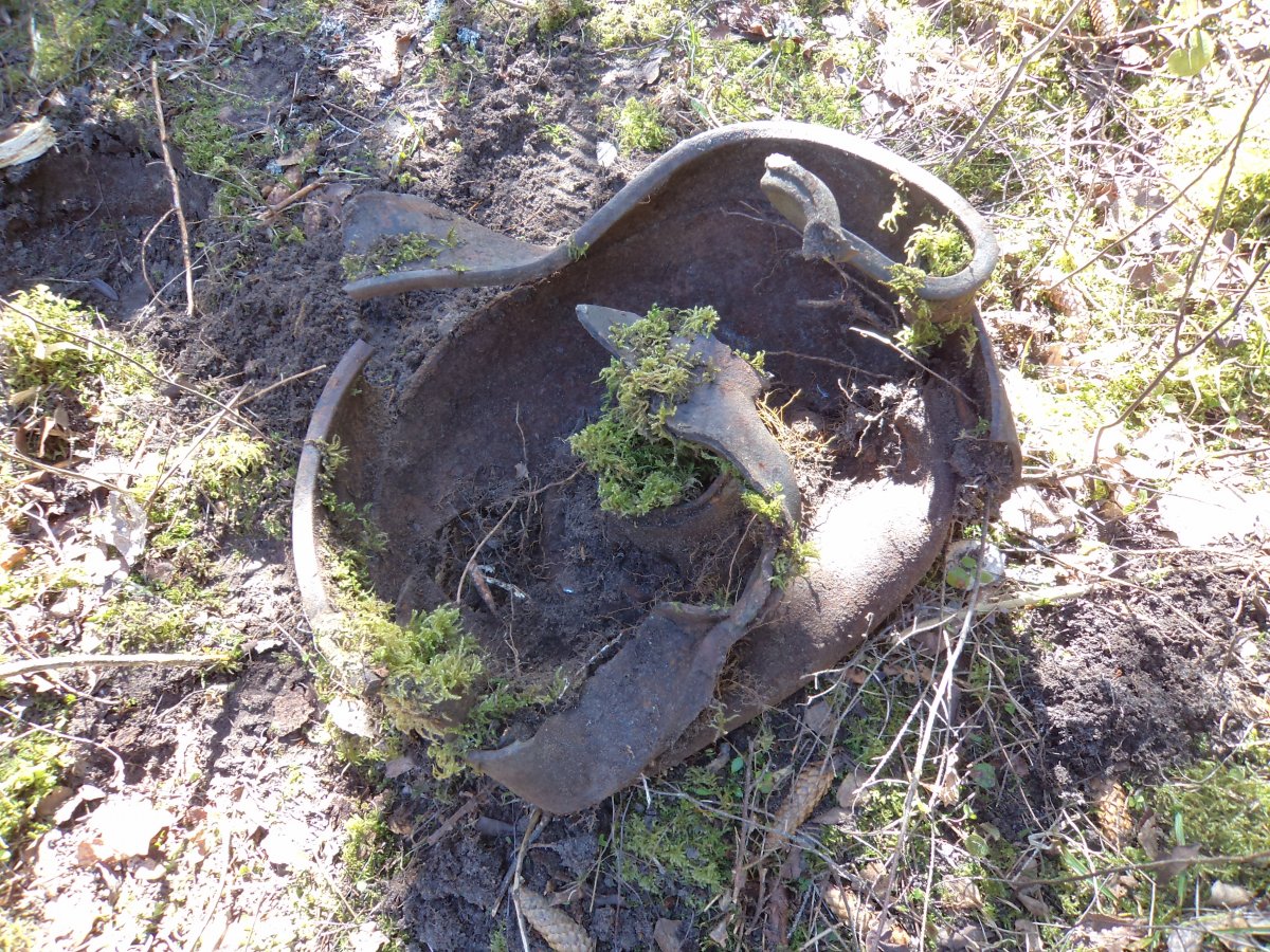 Шашка драгунская солдатская образца 1881 года, переломана взрывом. Немецкие окопы осени 1944 года. Предположытельно, что "свистнули" из замка, который находится рядом. Результат взрыва противотанковой мины? (по близости три штуки поднял) Обломки пулемёта Дегтярёва Снаряд советской противотанковой пушки 45 мм