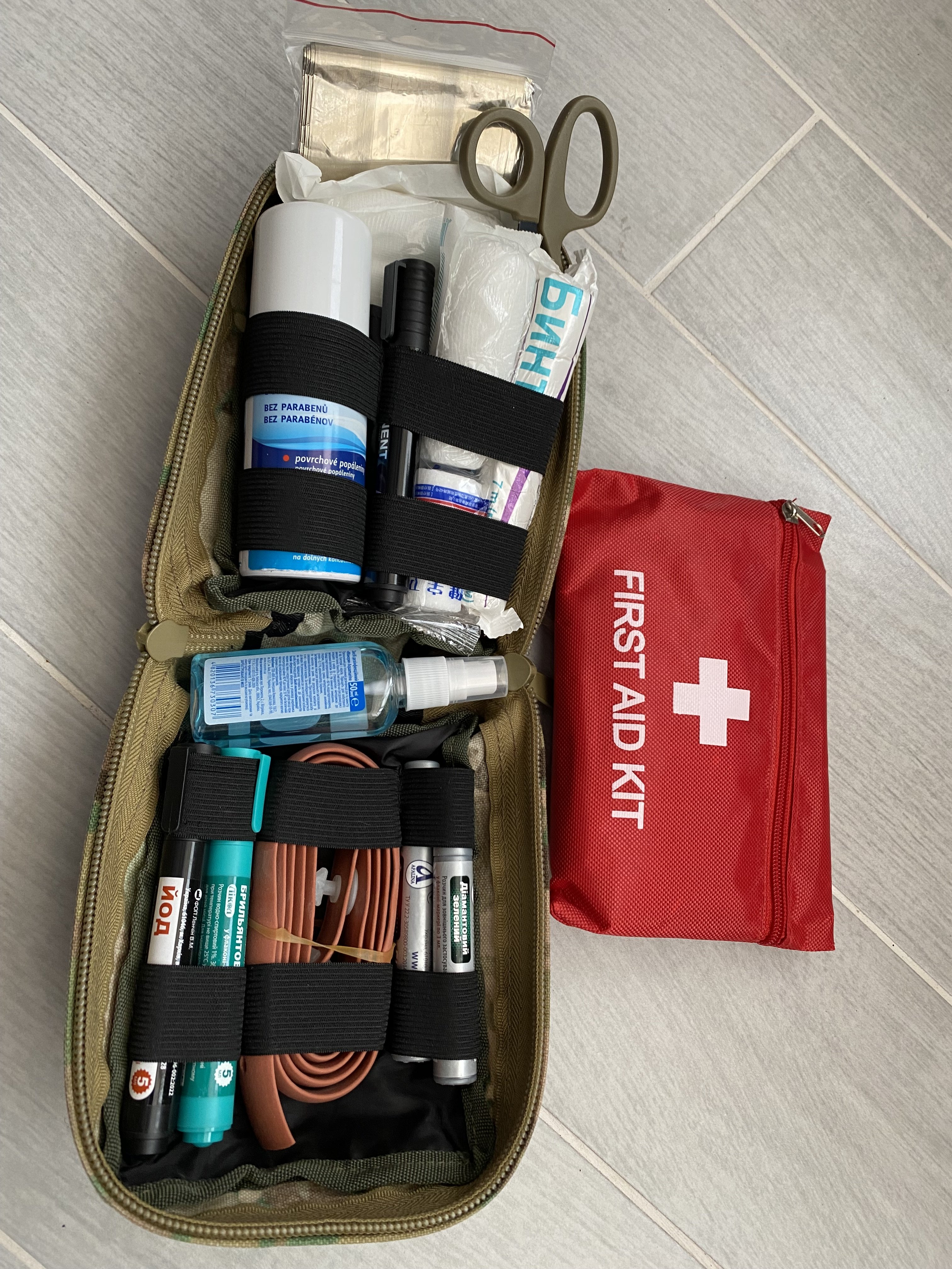 Аптечка індивідуальна First aid kit. В ній зібрані маркери йоду, зеленки, бинти для перевʼязки, рідкий пластир в балончику, вкладка з таблетками, пластиром і т.д. Є термоковдра, атравматичні ножиці, джгут Есмарка (за додаткову плату можу покласти турнікет Cat g7) Аптечка збиралась для себе, як індивідуальна від порізів, подряпин, невеликих ран, з набором таблеток від різних видів болю, жарознижуючих та знеболюючих засобів. Ціна 1200 грн
