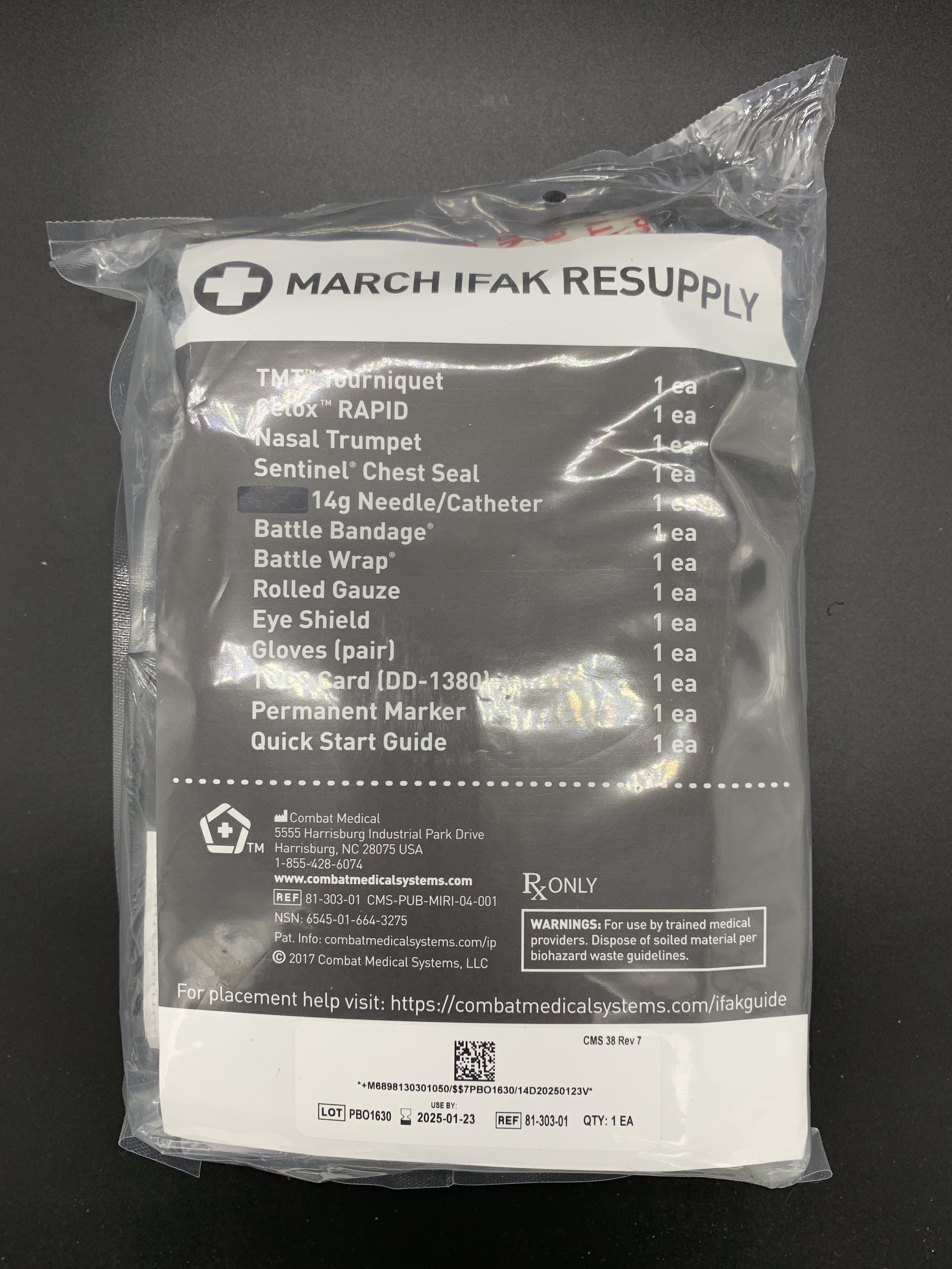 Аптечка MARCH™ IFAK Resupply Ціна 3300 грн Виробник "Combat Medical" (США) Набір MARCH™ IFAK Resupply призначений для використання в якості поповнення стандартного IFAK армії США IFAK. Використовуючи перевірену в бойових діях практику організації та стандартизації комплекту, MARCH™ IFAK Resupply розроблено для використання в найнесприятливіших умовах. Він використовує медичне обладнання MARCH™ у кольоровій системі для лікування п’яти основних причин смерті на полі бою, якій можна запобігти. Він постачається з короткими довідковими картками для завершення системи. Cклад: 1. турникет TMT™ Tourniquet 2. гемостатик Celox RAPID 3. змащений повітряпровід Nasal Airway 4. оклюзійна наліпка Sentinel Chest Seal 5. декомпресійна голка TPAK 14 ga 6. пов*язка Battle Bandage 7. пов*язка Battle Wrap 8. бинт Rolled Gauze 9. очний щиток з тканевим захистом з полікарбонату Eye Shield w/ Garter – Polycarbonate 10. Перчатки нитрілові (1 пара) 11. картка пораненого TCCC Card DD-1380 12. чорний маркер Mini-Sharpie 13. навчальний міні-посібник Quick Start Guide