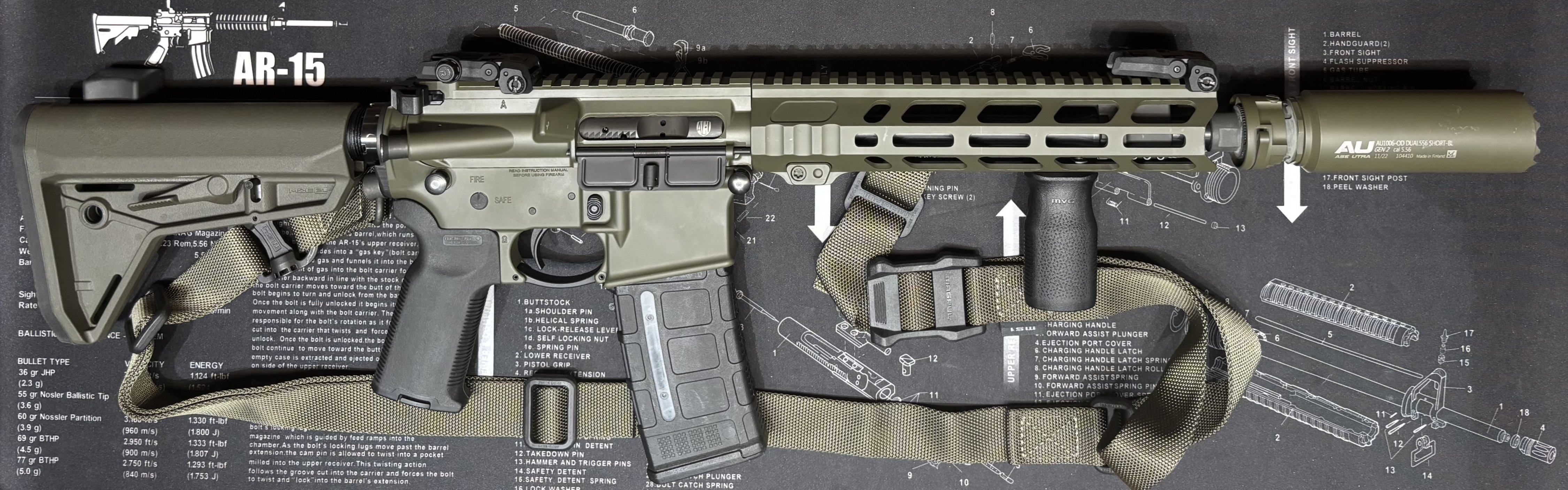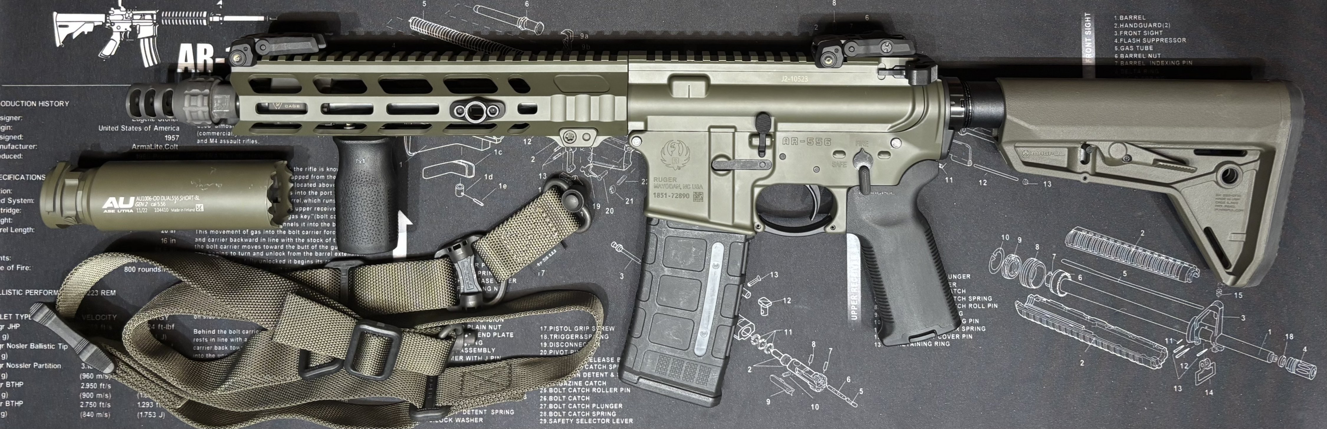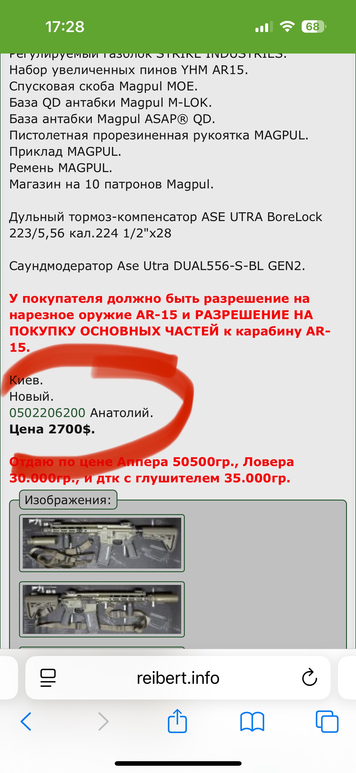 Карабин AR-15 ANDRO/RUGER 10.3 Карабин, собран с двух основных частей Аппер в сборе Andro Corp Industries Upper Reclever 10.5 кал. 5.56 и Ловер RUGER AR-556. Все основные и дополнительные запчасти абсолютно НОВЫЕ, аппер покупался в магазине «Прапорщик», ловер в магазине «Ствол». Дополнительно: Покраска CERAKOTE аппер, ловер и цевье. Двухсторонняя ручка взвода Radian. Регулируемый газблок STRIKE INDUSTRIES. Набор увеличенных пинов YHM AR15. Спусковая скоба Magpul MOE. База QD антабки Magpul M-LOK. База антабки Magpul ASAP® QD. Пистолетная прорезиненная рукоятка MAGPUL. Приклад MAGPUL. Ремень MAGPUL. Магазин на 10 патронов Magpul. Дульный тормоз-компенсатор ASE UTRA BoreLock 223/5,56 кал.224 1/2"x28 Саундмодератор Ase Utra DUAL556-S-BL GEN2. У покупателя должно быть разрешение на нарезное оружие AR-15 и РАЗРЕШЕНИЕ НА ПОКУПКУ ОСНОВНЫХ ЧАСТЕЙ к карабину AR-15. Киев. Новый. 0502206200 Анатолий. Цена 2700$. Отдаю по цене Аппера 50500гр., Ловера 30.000гр., и дтк с глушителем 35.000гр.