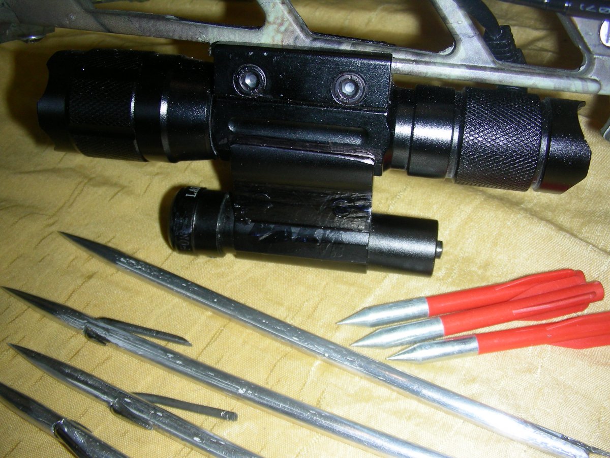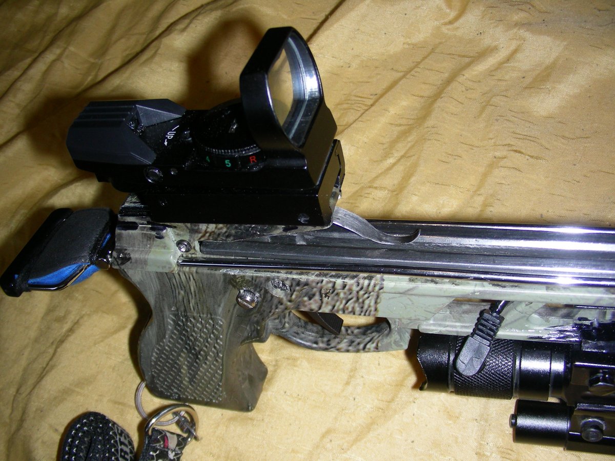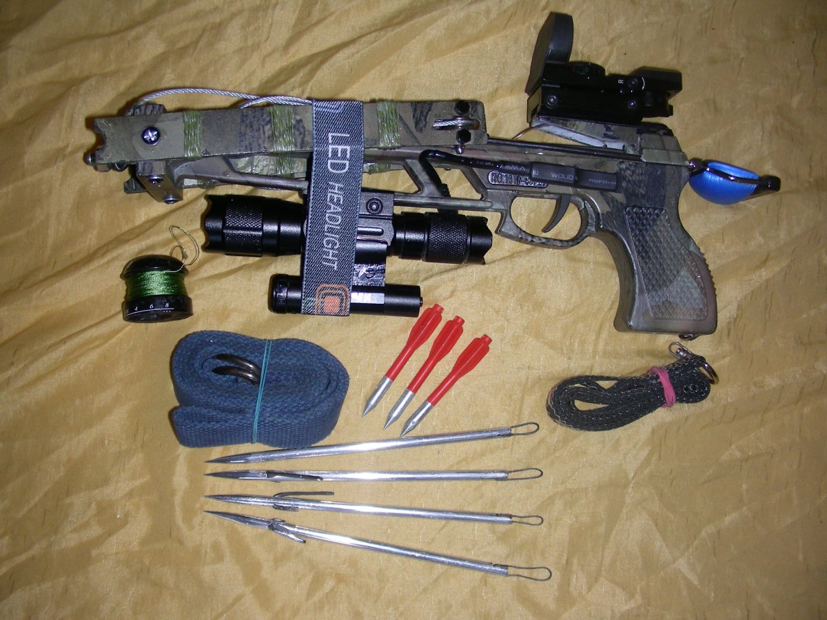 Представляется образец, прошедший проверку в реальных условиях. Базовая компоновка, двойной комплект усиления дуг, выдвигаемый плечевой упор, фал на шпуле , способ крепления фала к стреле и другие мои *ноу хау* сохранились. Впервые испытан КП нового типа - открытый, намного функциональный, правда, подороже предыдущих - впечатления самые положительные. Также опробованы дюралюминиевые 17 см стрелы, весом по 12 гр (три с гарпунными, подвижными наконечниками, одна пристрелочная). - эффект сопоставим по точности и дальности с титановыми, но требуют к себе более бережного отношения. Были сомнения в надежности поражения цели через крупную чешую или шкуру - увеличенная скорость полета стрелы из - за уменьшенного веса не оставила сомнениям ни единого шанса. Еще один плюс - новый, более продвинутый подствольный фонарь , повышенной светосилы и главное - с одним режимом работы, без дурацкого строба, тактическая кнопка бесподобно вписалась в констрекцию Поменял местами расположение ЛЦУ и фонаря - на мой взгляд стало более функционально. ПНВ не выставляется, так, как имеются пока к нему серьезные претензии, буду искать более подходящую модель, отсутствие ночника существенно усложнило процесс. но может это уже дело привычки . Этот образец остался без кейса - на то есть свои причины, ( возросла себестоимость новых комплектующих), размещается в импровизированной пенопластовой коробке. Добавлены в комплект три пластиковых болта со стальными наконечниками - оказалось, что ими очень эффективно можно добирать подранков - никогда бы раньше об этом и не подумал. Итого - представленный комплект ( без ПНВ) сохранил старую цену - 5500 гр. Большая просьба ко всем, заинтересовавшихся моим изделием - все вопросы - только в личку. С ув.
