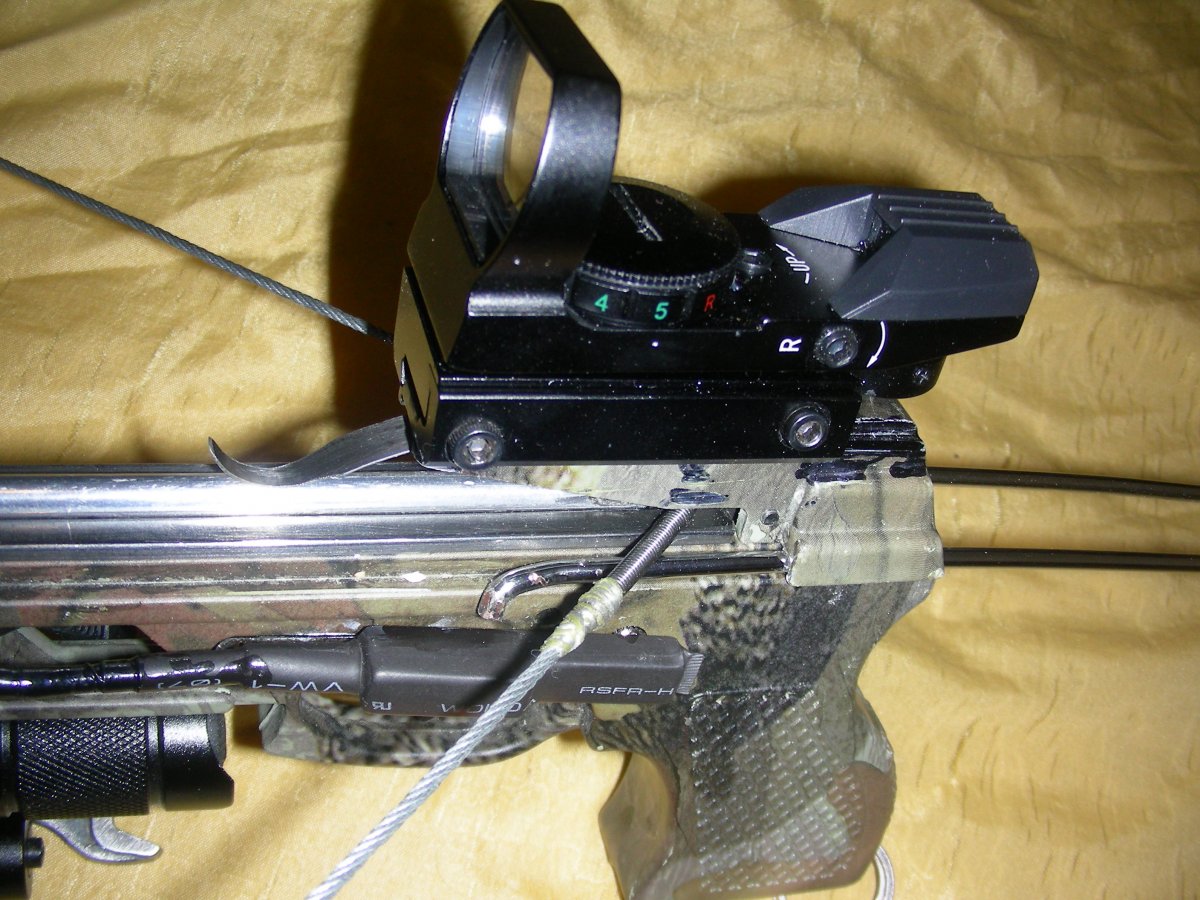 Арбалет продан и уехал по делам на Киевское море. Представляется новый образец с укороченной тетевой, улучшенными креплениями ремня - упора для заряджания и бюджетным колиматором. Как и каждый до него, образец прошел реальную проверку в полевых условиях - скорость стрелы существенно возросла (стрела проходит дичь навылет), колиматор функционирует, процесс заряджания несколько утяжелился, но тем не менее, я зарядку проводил без применения натяжителя. ЛЦУ, фонарь с тактической кнопкой, шпуля с фалом, упор и тп. - идентичные ранним проверенным образцам. За счет бюджетного КП удалось существенно снизить цену - 5000 гр. (доп. опции - стрелы стальные, натяжитель, ПНВ - по старым расценкам) С ув.