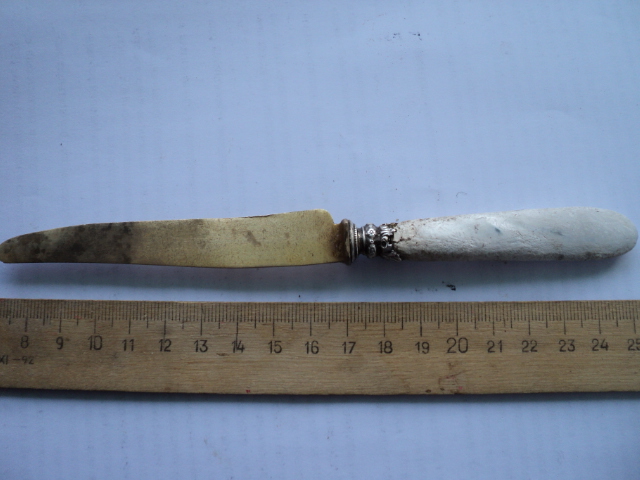 Почему-то вспомнились стихи Грибоедова: "Не то на серебре, на золоте едал!" Вырыт на немецких позициях. Только помыт водой, в районе клейма почищен щеткой. Ручка перламутр, на лезвии в ромбе вроде буквы "PF". Может это проба такая? Может лезвие быть золотым?