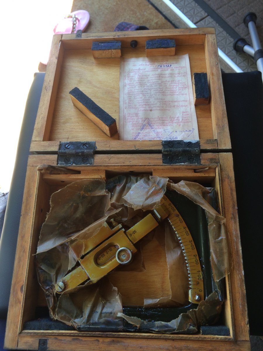 Добрый вечер! Механический квадрант с уровнем "К-1" предназначен для измерения и установки углов наклона в вертикальной плоскости от 0 до 90° (https://upload.wikimedia.org/wikipedia/commons/0/05/K1box.jpg). Использование в ствольной артиллерии: придание стволу заданного угла и измерение угла возвышения, приданного стволу. Изготовитель - завод "Калибр", Москва (https://upload.wikimedia.org/wikipedia/ru/2/2e/Caliber_of_Moscow.jpg). Этот новый (https://images.ua.prom.st/1723577340_w700_h500_kvadrant-mehanicheskij-s.jpg) хотят продать за 5400 грн., а реально, думаю, если еще и повезет, то: https://reibert.info/threads/kvadrant-mexanicheskij-s-urovnem-k-1-kvadrant-artillerijskij.696115/