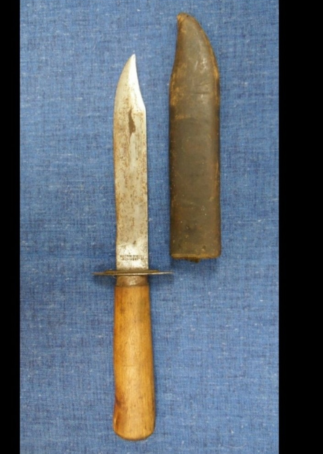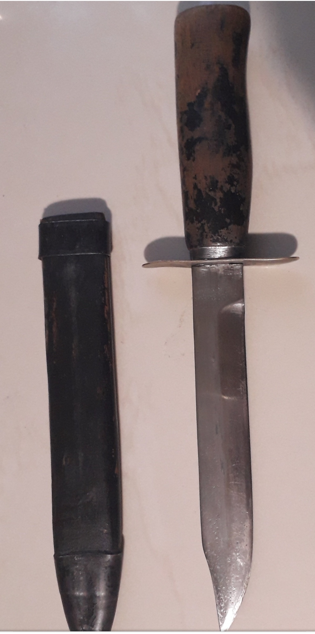 Ручка покрашена и обтерта искусственно.Гарда не по размеру.Клинок По внешним параметрам с расширением к острию.Следы на гарде свежие после обработки.Футляр ножен просматривается фактура сосны, делалась из липы, может на таких объемах из бука. Все очевидно на реплику Ещё если можно кожаную антабку и зацеп фото