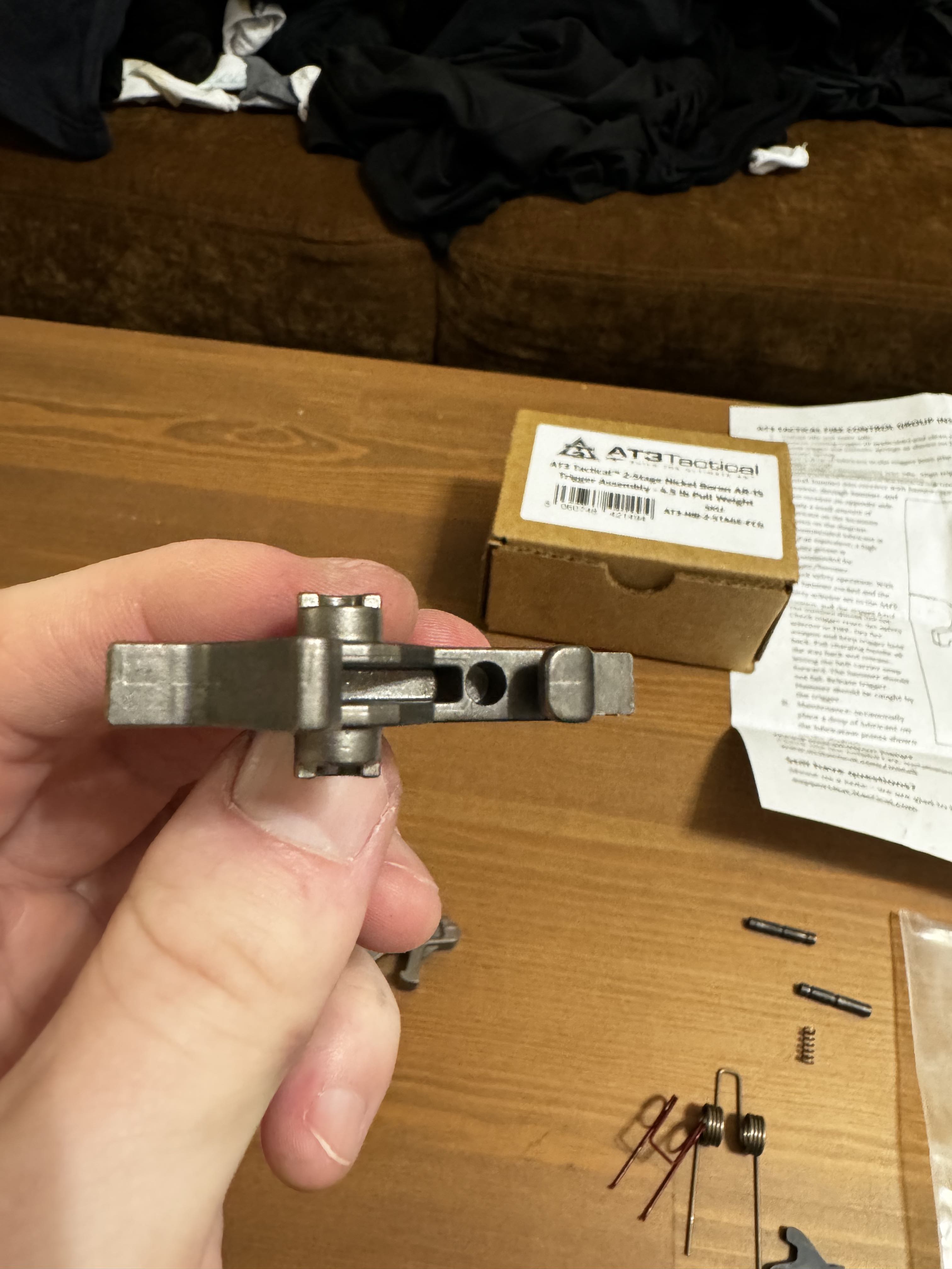 Продам двоступінчастий ударно спусковий механізм до гвинтівок AR-15 або AR-10 від компанії AT3 Tactical. Покриття нікель-бор, що забезпечує дуже мʼяке та чітке натискання. Такий же УСМ але з іншими пружинами стоїть на Savage MSR15 2.0. Настріл на AR-15 близько 250 пострілів, повністю справний, коритися цілісне, є незначні сліди використання. Більш детальну інформацію можете подивитися на офіційному сайті. Якщо потрібно, додам полегшені пружини JP. https://www.at3tactical.com/product...on-ar-15-trigger-assembly-4-5-lbs-pull-weight Ціна 5500 .