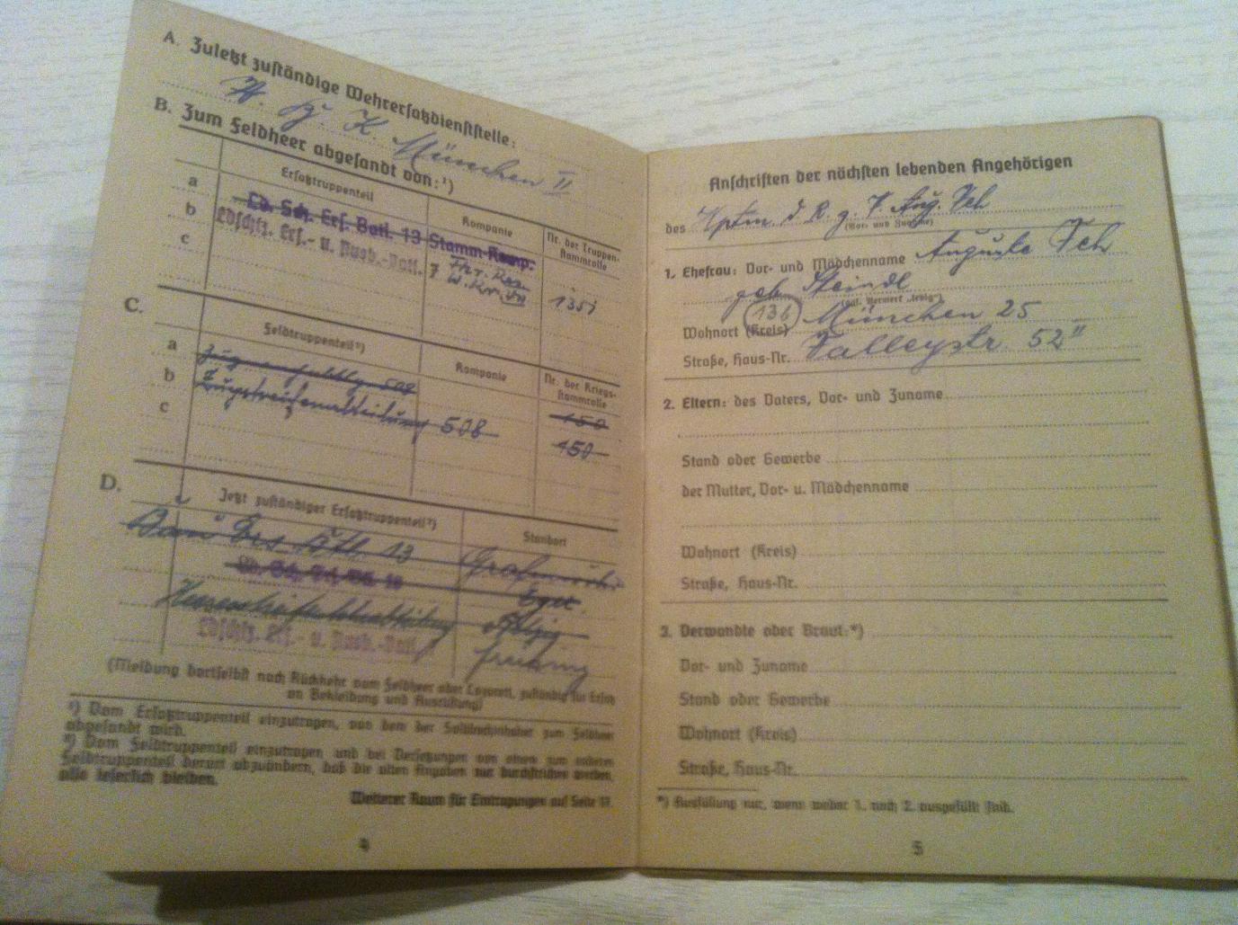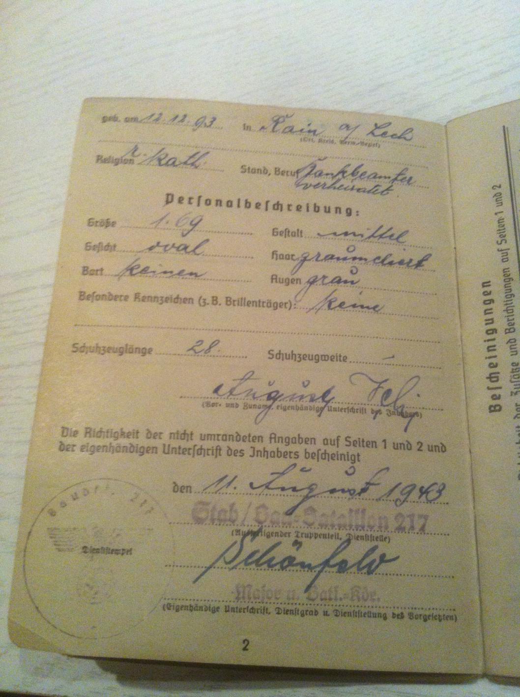 Frundsberg, спасибо за фотографии! Только он не Фей, а просто Фе, я думаю По нему: видный дядька: вояка, капитан (Hauptmann), католик, 1893 года рождения (12.12.93), родом из Rain am Lech, 1.69 ростом, без бороды, среднего телосложения, с серыми глазами и тронутыми сединой волосами. Семейный статус: женат (ушёл жених ), на какой-то Анг... Ауг... чёрт её разберёт. Место проживания (тёзка же!): Мюнхен, 25, Валлейштрассе 52. https://maps.google.com/maps?hl=de&client=opera&channel=suggest&q=valleystraße+52+münchen&ie=UTF-8 Что интересно: жил в Харрасе. Это сейчас находится в шестом квартале Sendling (Зендлинг). Интересно, как это было раньше.