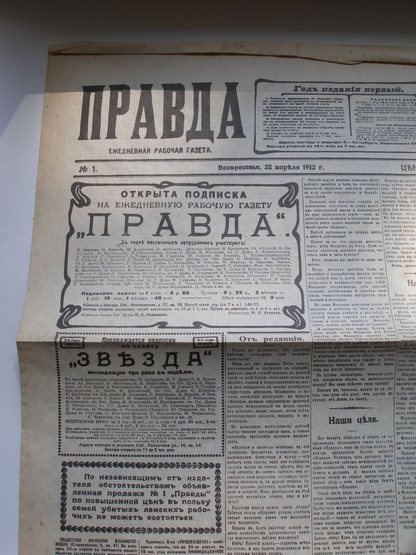 вот материал отуда же кому лень идти по ссылке 6-я Всероссийская (Пражская) конференция РСДРП(б) приняла по инициативе В. И. Ленина решение о выпуске массовой рабочей большевистской ежедневной газеты и 22 апреля (5 мая) 1912 г. вышел первый номер «Правды». Тогда «Правда» не была официальным органом ЦК РСДРП(б), таковым считалась нелегальная газета «Социал-демократ», печатавшаяся за границей и ввозившаяся в Россию контрабандно. Еще до этого выходила с 1908 до апреля 1912 социал-демократическая газета «Правда» под редакцией Л. Д. Троцкого, международный отдел которой вёл А. А. Иоффе (т. н. «Венская „Правда“»). Выход второй газеты с тем же названием вызвал резкую полемику, в том числе даже с обращением к немецким социалистам в качестве третейских судей, но это ни к чему не привело, и название «Правда» сохранилось за ленинской газетой. Тираж газеты был около 40 тыс. экземпляров, иногда до 60 тыс. ( http://ru.wikipedia.org/wiki/Правда_(газета) )(с) такчто у Вас походу пилотный выпуск.