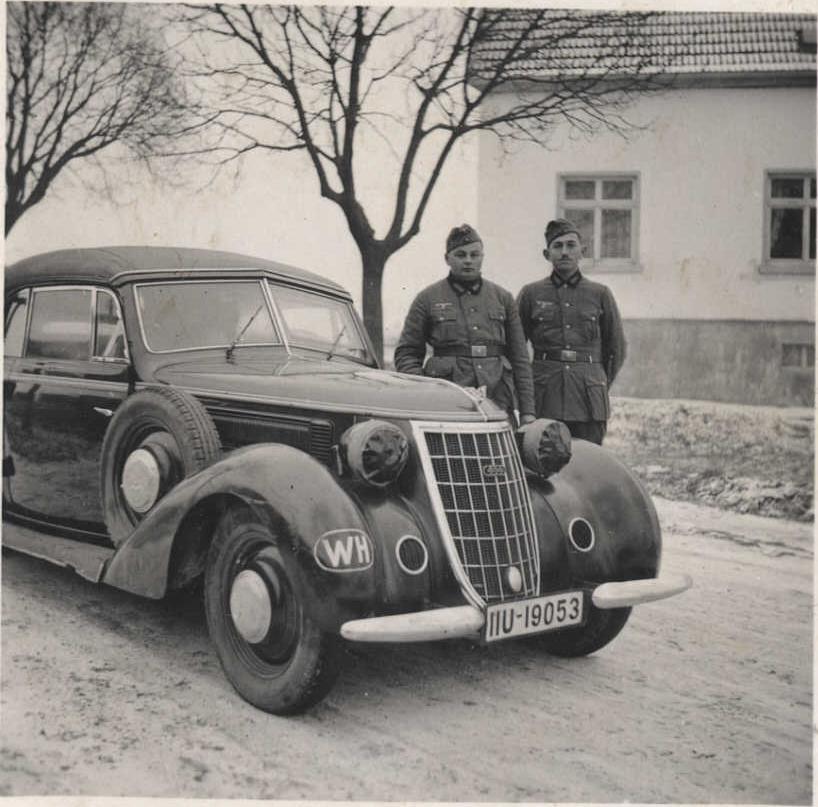 Wanderer Название фирмы существует с 1911 года и переводится как «путник» или «странник»."Вандерер" так же как и DKW выпускал легковушки и мотоциклы, но при этом модельный ряд легковых автомобилей был представлен машинами среднего и высшего класса.По дизайну, из тех машин,что встречаются на фото с номерными знаками Вермахта, я бы условно разделил их на «ранние» (выпускавшиеся в 1932-1938 годах) и «поздние» ( с 1936 по 1941 года). 1-5.W 21. Выпускался в 1933-35 годах.За это время было изготовлено 4 564 ( по другим данным- 5 019) единиц.На машине устанавливался 6-ти цилиндровый двигатель, мощностью 35 л.с. и 4-х скоростная коробка передач.К слову, все автомобили фирмы "Вандерер" оснащались рядными 6-ти цилиндровыми бензиновыми моторами.Мах.скорость составляла 95 км/ч. Внешний вид автомобиля отличали два ряда вертикальных вентиляционных прорезей с каждой стороны капота и широкие наклонный полосы на облицовке радиатора,как бы «вогнутой» во внутрь. 6-8.W 22. На этой модели был немного более мощный двигатель (40 л.с.),позволявший ей разгоняться до 100 км/ч.Выпускалась 22-я параллельно с W21 и за три года было собрано 5 799 машин.Внешне от 21-й эта модель отличалась незначительно-наклонный полосы на облицовке радиатора были сделаны боле узкими.