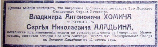 1. Английский двухместный разведчик "Сопвич" (Sopwith Strutter): на нем разбились Хомич с Аладьиным 2. Некролог в одной из Новочеркасских газет