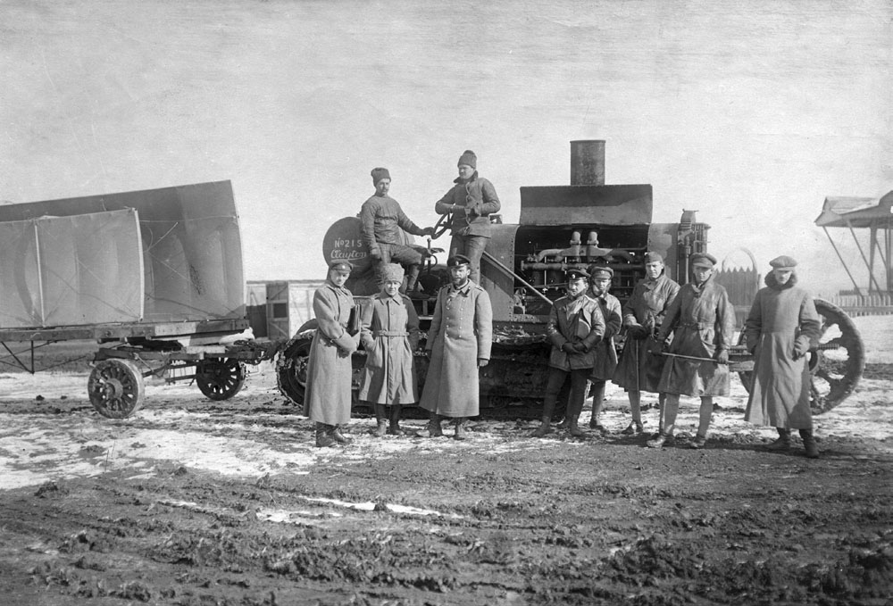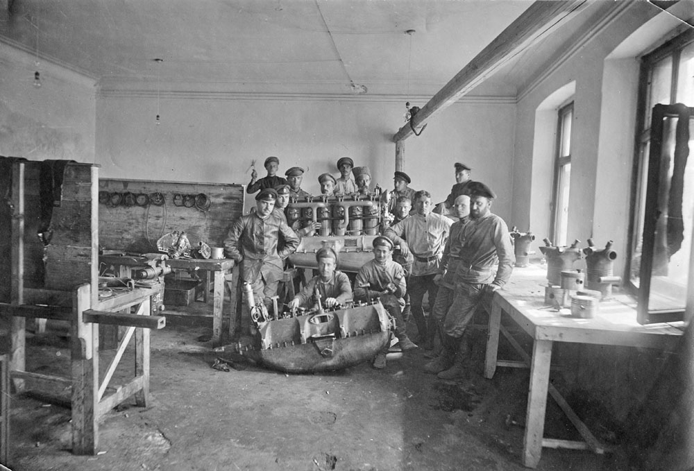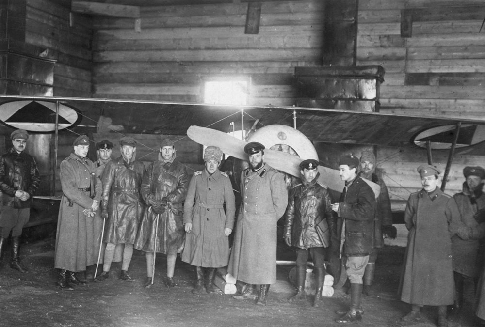 Ангар-амбар Донской авиации. В центре — В. Г. Баранов (в папахе), справа — И. И. Стрельников. Февраль — март 1919г.