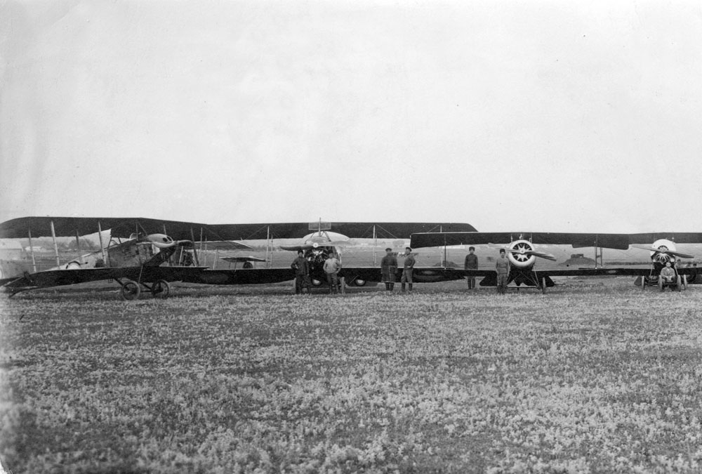 Аэродром в Новочеркасске. Второй справа: В. Г. Баранов, третий — И. С. Стрельников. Февраль — март 1919г.