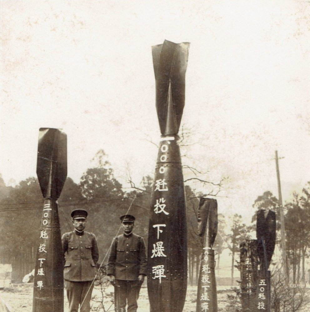 Japanese soldiers standing with a variety of bombs