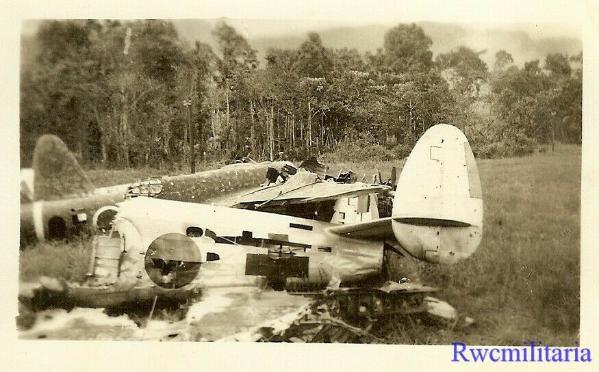 1) US troops look over surrendered camo Japanese Ki-45 fighter plane 2) US View of captured Japanese G4M "Betty" bomber on airfield; 1945 3) US Soldier with shot down Japanese Ki-46 recon plane in field 4-5) US Troops with shot down Japanese Ki-67 bomber wreckage in field 6) Abandoned camo Japanese Ki-57 transport plane by bomber wreckage
