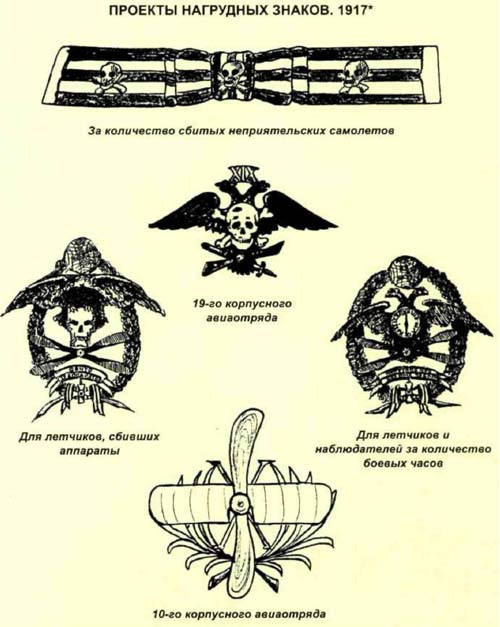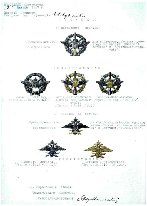Сводная таблица нагрудных знаков и орлов на погоны военных летчиков и летчиков-наблюдателей, подготовленная Техническим комитетом ГИНТУ в конце декабря 1916 г. при проектировании новых соединенных знаков (РГИА)