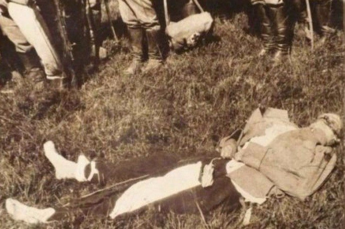 Последнее фото Нестерова. Останки русского авиатора Петра Николаевича Нестерова, совершившего в 8 сентября 1914г., первый в истории авиации воздушный таран с самолетом противника, управляемым австрийским военным летчиком бароном Фридрихом фон Розенталем. (фото найдено в 1980 году). После совершения воздушного тарана, в результате которого вместе с противником погиб и сам Нестеров, первыми к его телу подбежали двое русских солдат, которые быстро сняли с него сапоги, из карманов вытащили деньги и сложив Нестерову руки на животе, мародеры убежали. (из воспоминаний сослуживца Нестерова). Этот факт стыдливо замалчивали. Личности мародеров установлены небыли. Из книги В.Соколова "Таран Нестерова": Когда мы выехали из города, то увидели, что все поле было покрыто людьми, бежавшими к месту падения самолетов. Они упали километрах в пяти от Жолкиева, с левой стороны шоссе, ведущего в Раву-Русскую. Никаких строений поблизости не было, но повсюду виднелись палатки военных лагерей: километрах в двух, около леса, стояли казаки; в километре от «Морана», за дорогой, разместился большой обоз, а ближе к Жолкиеву, около села Воля Висоцка, виднелись большие палатки походного госпиталя. Около разбитых самолетов уже толпилось человек двадцать солдат и казаков. «Моран» Нестерова лежал шагах в тридцати от дороги, на невспаханном поле. Шасси у него было разбито, крылья сложились, мотора не было, рули погнуты. Перед самолетом шагах в двадцати лежал Нестеров. Его уже кто-то прибрал как покойника, сложив ему руки на груди. Его тело, руки и ноги были целы, даже одежда нигде не была порвана. Крови нигде не было видно. Только на правом виске виднелась вмятина с капелькой крови. Мне сразу бросилось в глаза, что на голове у Петра Николаевича не было шлема, а на ногах ботинок, он лежал в шерстяных чулках. Шагах в пятидесяти от «Морана» было небольшое болото, упиравшееся в дорогу. Часть его была покрыта камышами, среди которых был виден «Альбатрос» с задранным кверху отломанным хвостом. На берегу болота в луже крови лежал разбившийся вдребезги австрийский солдат. Он, очевидно, выпал с падающего австрийского самолета. Минут через пять после нас приехал автомобиль 1-го отряда в летчиками Кованько и Передковым и с летчиком-наблюдателем Генерального штаба Лазаревым. Они наблюдали бой с аэродрома. Мы молча, со слезами на глазах смотрели на лежавшего перед нами Нестерова. Он был нашим другом и учителем, которому мы подражали и которым мы гордились. После нескольких минут молчания я спросил у Кованько, который после смерти Нестерова вступал в командование 11-м отрядом: — Александр Александрович, почему Петр Николаевич без ботинок? Кованько пришел в себя. — Действительно... Странно... Улетал он в ботинках. — А где его шлем? — спросил Передков. — Непонятно... Я хорошо помню, что он, улетая, застегнул шлем, — сказал, вытирая слезы, Кованько. — Надо посмотреть документы. Он начал осматривать карманы куртки. Нашел записную книжку, носовой платок, перочинный нож, но бумажника не было. — Его обокрали! Обокрали, сволочи, мародеры! — закричал Александр Александрович. — Ведь Петр Николаевич приехал на аэродром прямо из казначейства, где он получил деньги для отряда... Кто первым подбежал к аэроплану? — обратился он к толпе солдат. Из расспросов солдат выяснилось, что первыми подбежали к «Морану