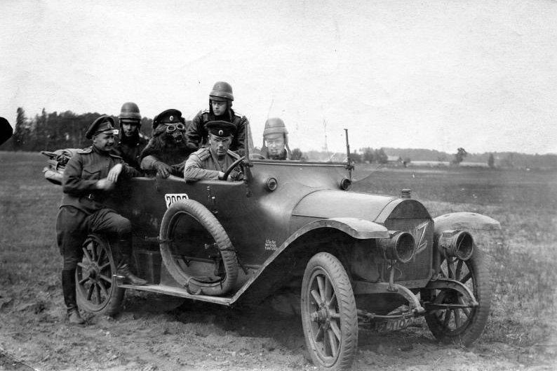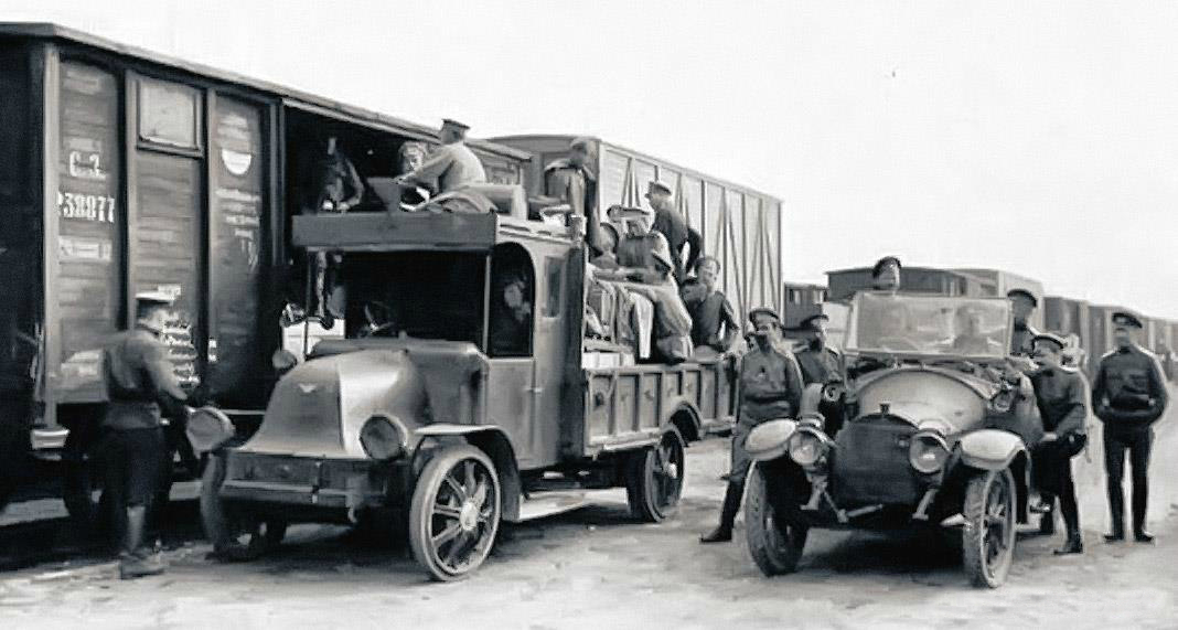Грузовой автомобиль Austin 50 HP из состава 1-й авиационной роты Русской армии, рядом легковым автомобилем Mercedes. Псков. 1916г.