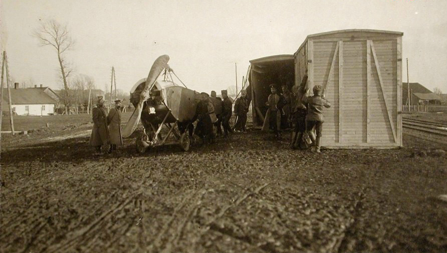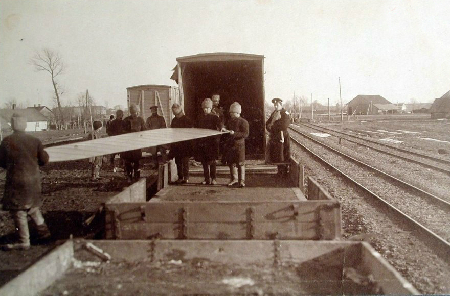 Выгрузка из вагонов новых летательных аппаратов, предназначенных для XII корпусного авиационного отряда. Польша, станция г.Кросно. 2 февраля 1915г.
