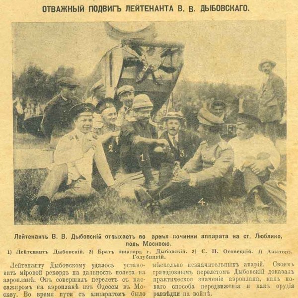 Дыбовский Виктор Владимирович (13 января 1884-1950). Окончил Морской корпус (1910 г.), Офицерский класс Учебного воздухоплавательного парка (1910 г.), Офицерскую школу авиации Отдела воздушного флота (1914 г.). На службе с 1901 года. 28.01.1904 г. зачислен в 19-й флотский экипаж. На эскадренном броненосце «Николай I» участвовал в Цусимском бою. В 1907 г. переведен из Балтийского в Черноморский флотский экипаж. С 03.07.1909 г. — командующий миноносцем №273. В июле 1912 года на летательном аппарате «Nieuport N.IV» совершил перелет по маршруту Севастополь — Харьков — Орёл — Тула — Москва — Санкт-Петербург. Расстояние в 2235 вёрст с 25-ю промежуточными посадками (из-за непрекращающихся неполадок в моторе) преодолел за 25 лётных часов, что по тем временам было беспрецедентным. В 1913 году в Риге на заводе «Мотор» построил оригинальный моноплан «Дельфин», с фюзеляжем обтекаемой формы. В 1914 году изобрёл и изготовил на заводе «Дукс» синхронизатор для стрельбы через винт аэроплана. С 1914 г. — военный летчик 20-го корпусного авиационного отряда, а с сентября 1915 года — в распоряжении генерала-квартирмейстера штаба 4-й армии. 1915-1917 года — Представитель Русского Морского Командования в Англии. Возглавлял Отдел приёмки авиационного имущества в Русском закупочном комитете. После февральского и октябрьского переворотов 1917 года Дыбовский домой более не возвращался. Умер в 1950 году в Берне (Швейцария), куда по причине нездоровья уже в преклонном возрасте переехал из США.