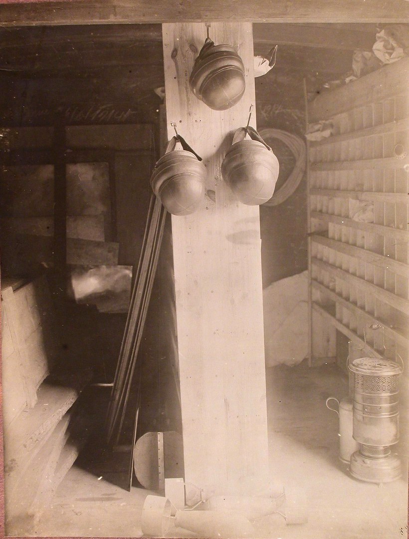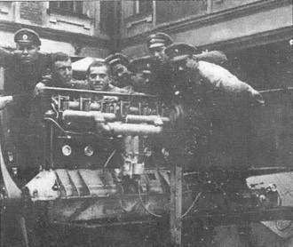 Вид части мастерской по сборке моторов, разместившейся в одном из вагонов железнодорожного состава, перевозившего подвижную авиационную мастерскую.