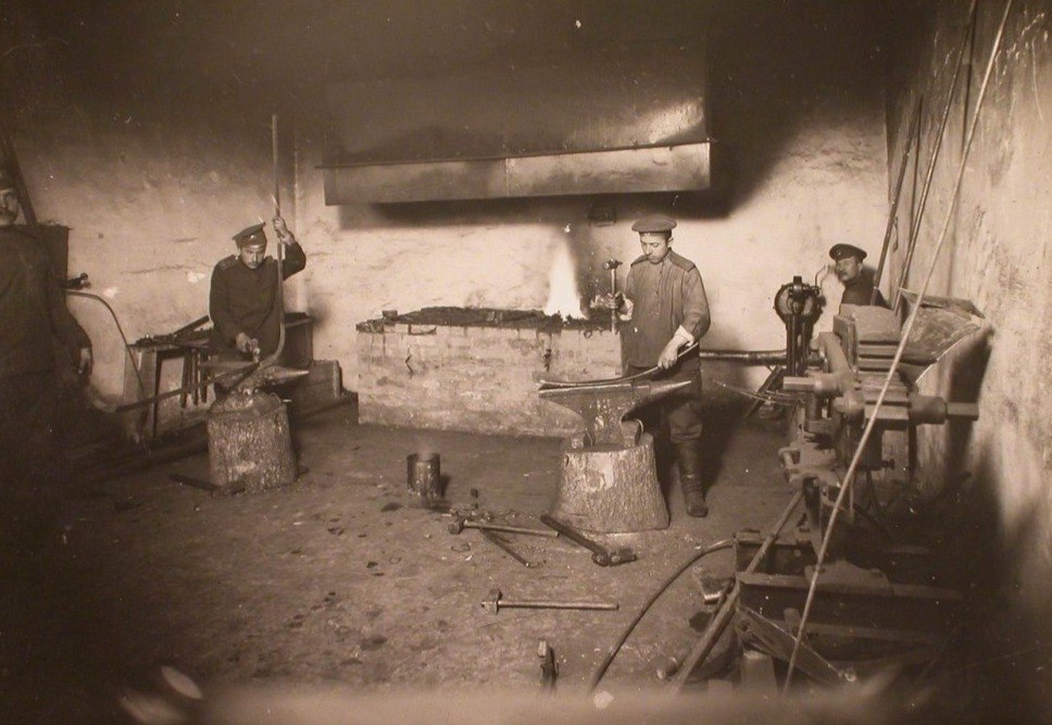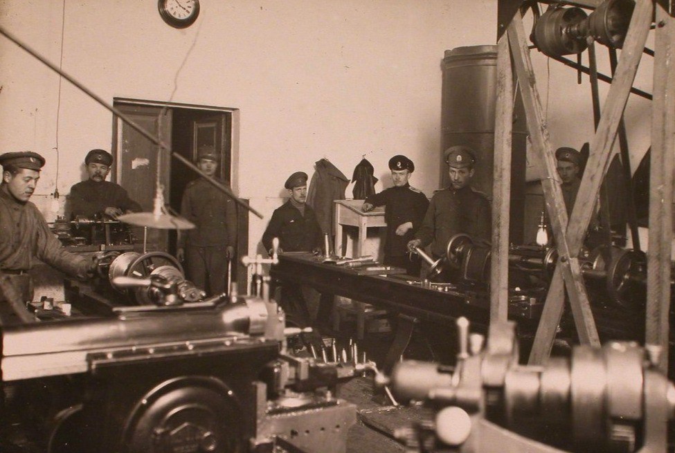 Подвижная авиационная мастерская 2-й авиационной роты. Вид помещения слесарной мастерской, разместившейся в одном из вагонов железнодорожного состава, перевозившего подвижную авиационную мастерскую.