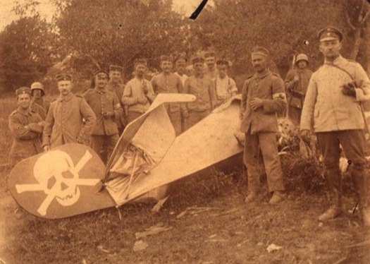 Русский летчик Евграф Николаевич Крутень у обломков австро-венгерского "Бранденбурга", сбитого им 24 мая 1917 года.