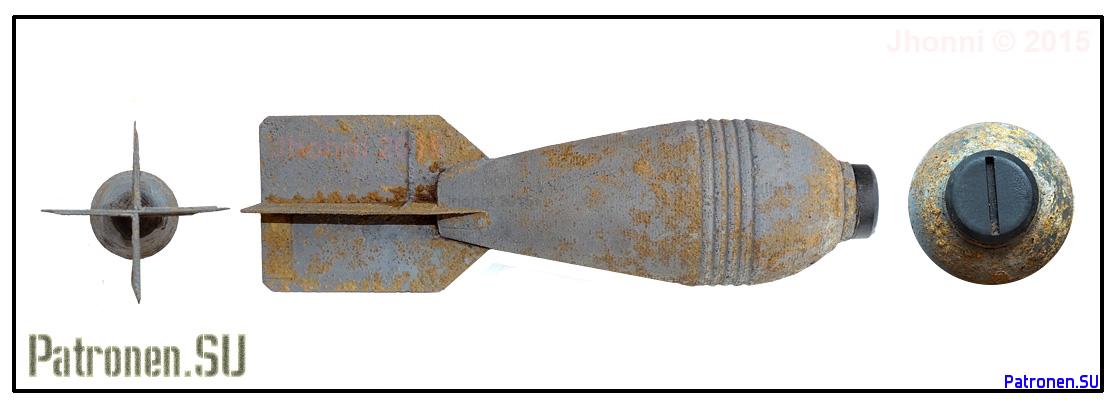АО-2,5-3сч. Ничего УНИКАЛЬНОГО в этом нет. "....С 1941 г. переделке в осколочные авиабомбы малого калибра подлежали и некондиционные корпуса 82-мм артиллерийских мин из сталистого чугуна, в большом количестве изготавливаемых для батальонных минометов до самого окончания войны. Материал их корпусов допускал сварное соединение с четырехперистым стабилизатором. В остальном «алгоритм переделки» полностью соответствовал вышеизложенному. Корпуса артиллерийских мин данного калибра изготавливали на Черкасском, Люберецком и Климовском механических заводах НКОМ, а также на заводе «Красный металлист»....."